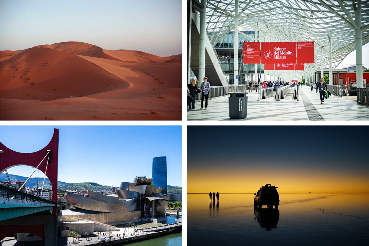 左上:サハラ砂漠・モロッコ|右上:ミラノサローネ本会場・イタリア・ミラノ|左下:グッゲンハイム・ビルバオ・スペイン|右下:ウユニ塩湖・ボリビア
