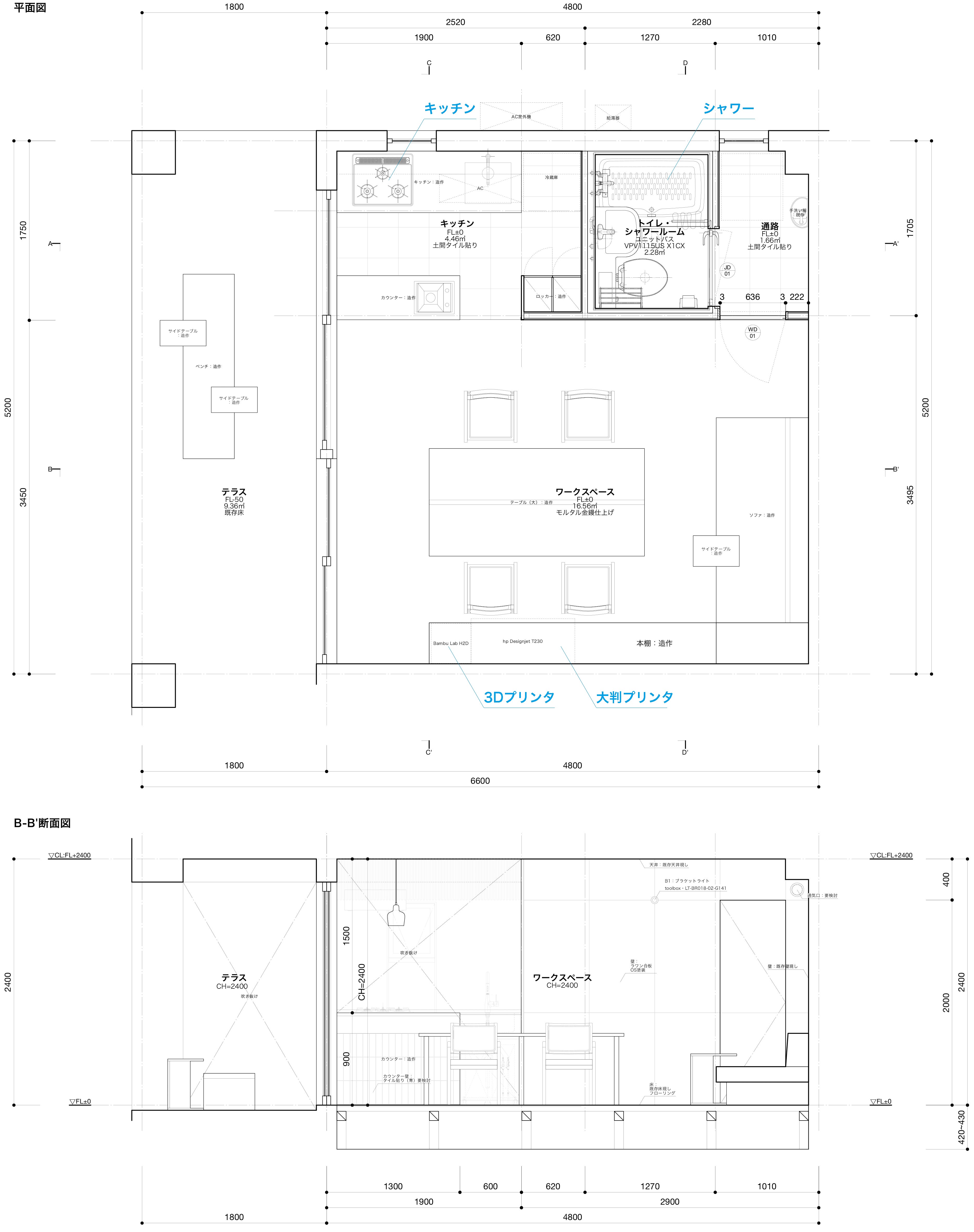 図面一式3Dプリンタや大判プリンタを備えたものづくり特化型で、24時間365日利用可能でシャワーやキッチンも備えたフレキシブルに使えるコワーキングスペースとなります。