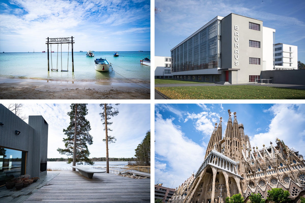左上:タオ島・タイ|右上:バウハウス・デッサウ校・ドイツ|左下:セルラキウス美術館・アートサウナ・フィンランド|右下:サグラダファミリア・バルセロナ・スペイン
