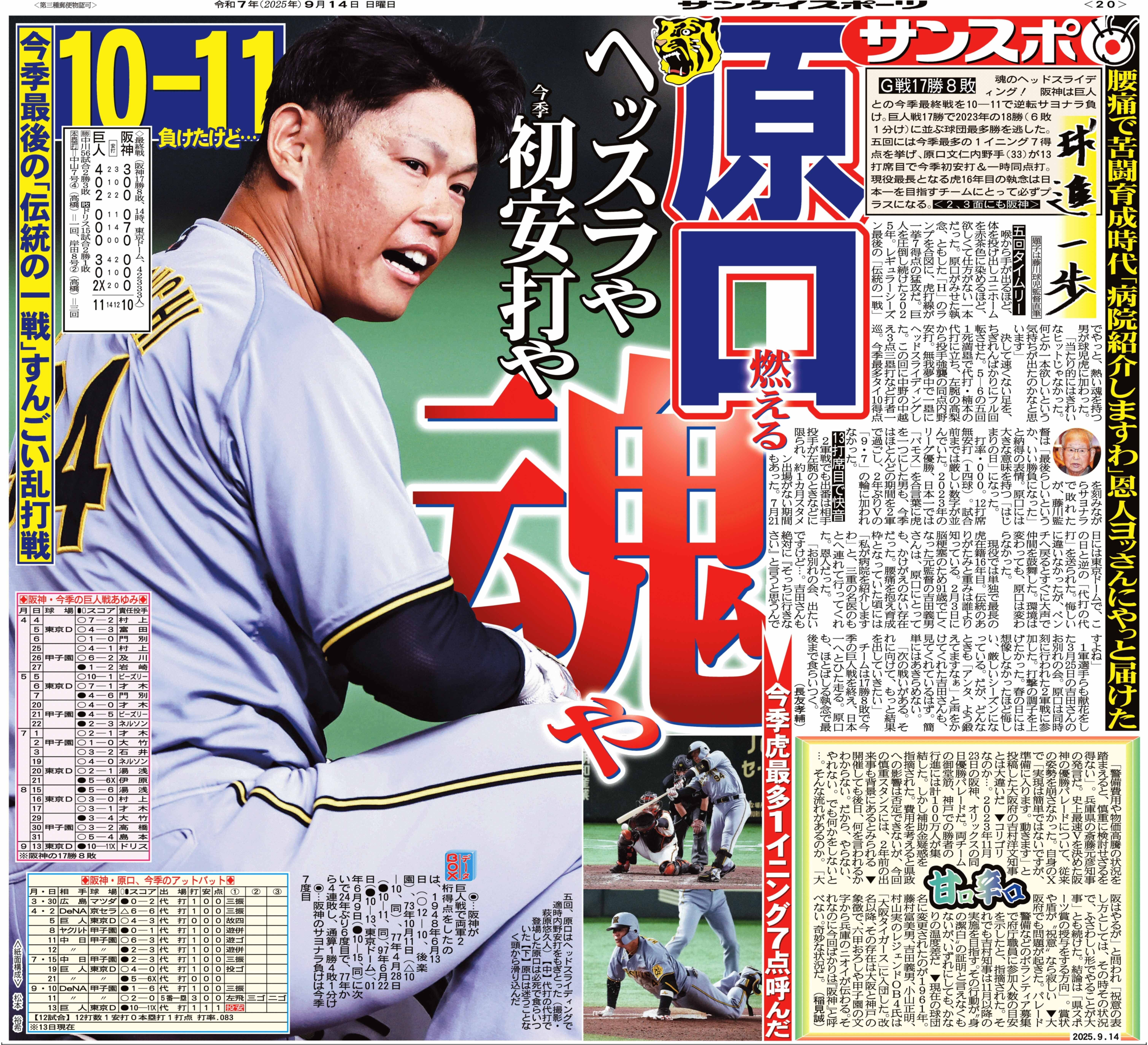 負けはしましたが、我らが原口文仁選手が代打で今季13打席目で執念の初ヒット。今季はほとんどを2軍で過ごし、優勝の輪にも加われなかった。2軍戦でも出場機会は限られ、やっと1軍に上がっても代打の代打を送られることもありました。そんな悔しさをぶつけた原口選手の魂の一打。魂のヘッドスライディングは、13日付サンケイスポーツ最終面で、恩人の吉田義男さんとの秘話など、たっぷりと掲載されています。ご一読してください。