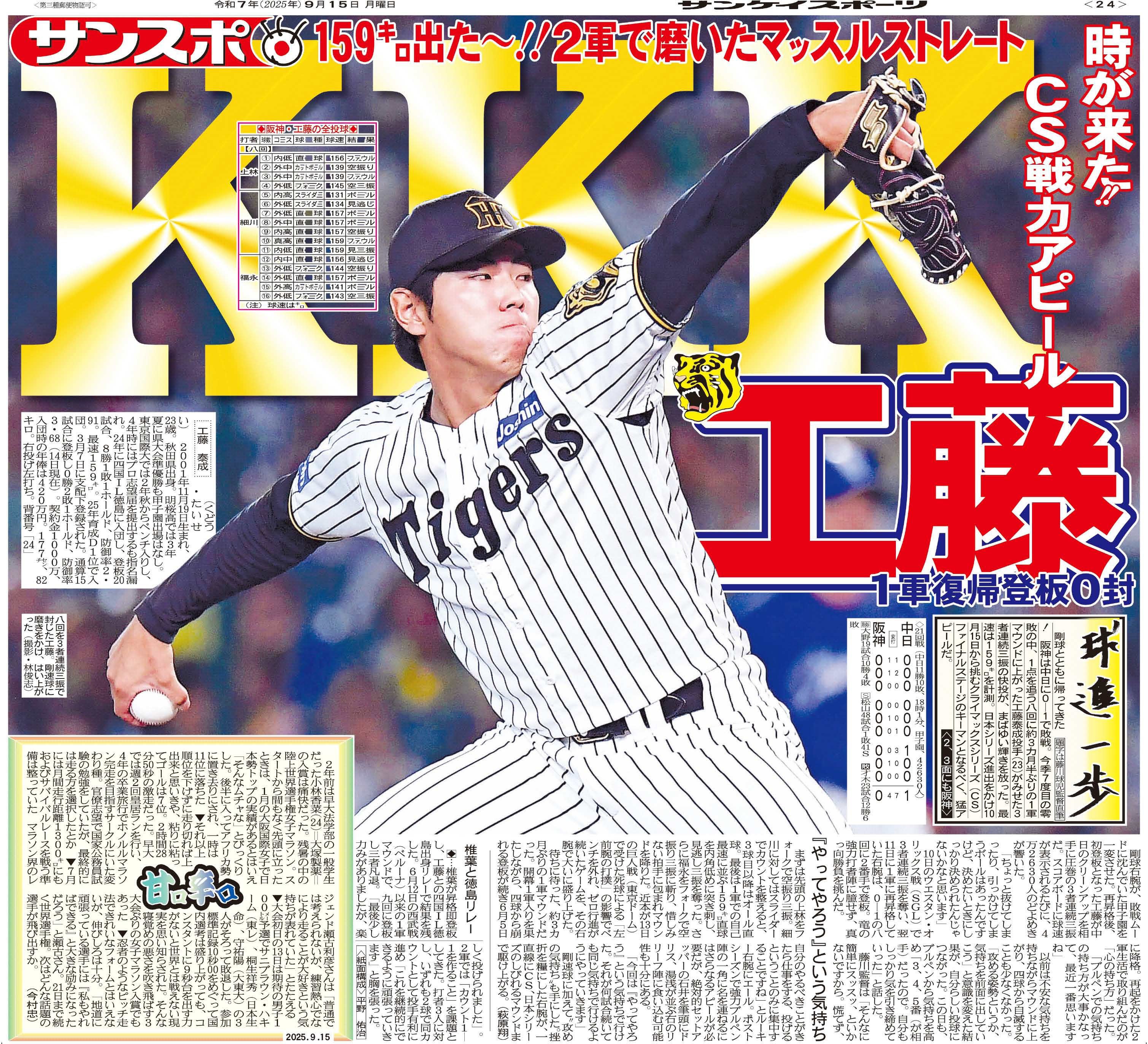 14日の阪神は中日に零封負け。ハーラートップを狙った才木浩人投手は7回1失点も勝ち星を増やせず。残念な結果に。明るい話題としては、2軍でマッスルストレートを磨いてきた工藤泰成投手。八回に3カ月ぶりの1軍マウンド。ここで3者連続三振の快投。最速は159キロ!ポストシーズンへのアピールとなりました。今季はキャンプから注目され開幕1軍に。前半は活躍しましたが、6月に2軍降格。必死に爪を研いで、今か今かと1軍昇格を待っていた工藤投手。