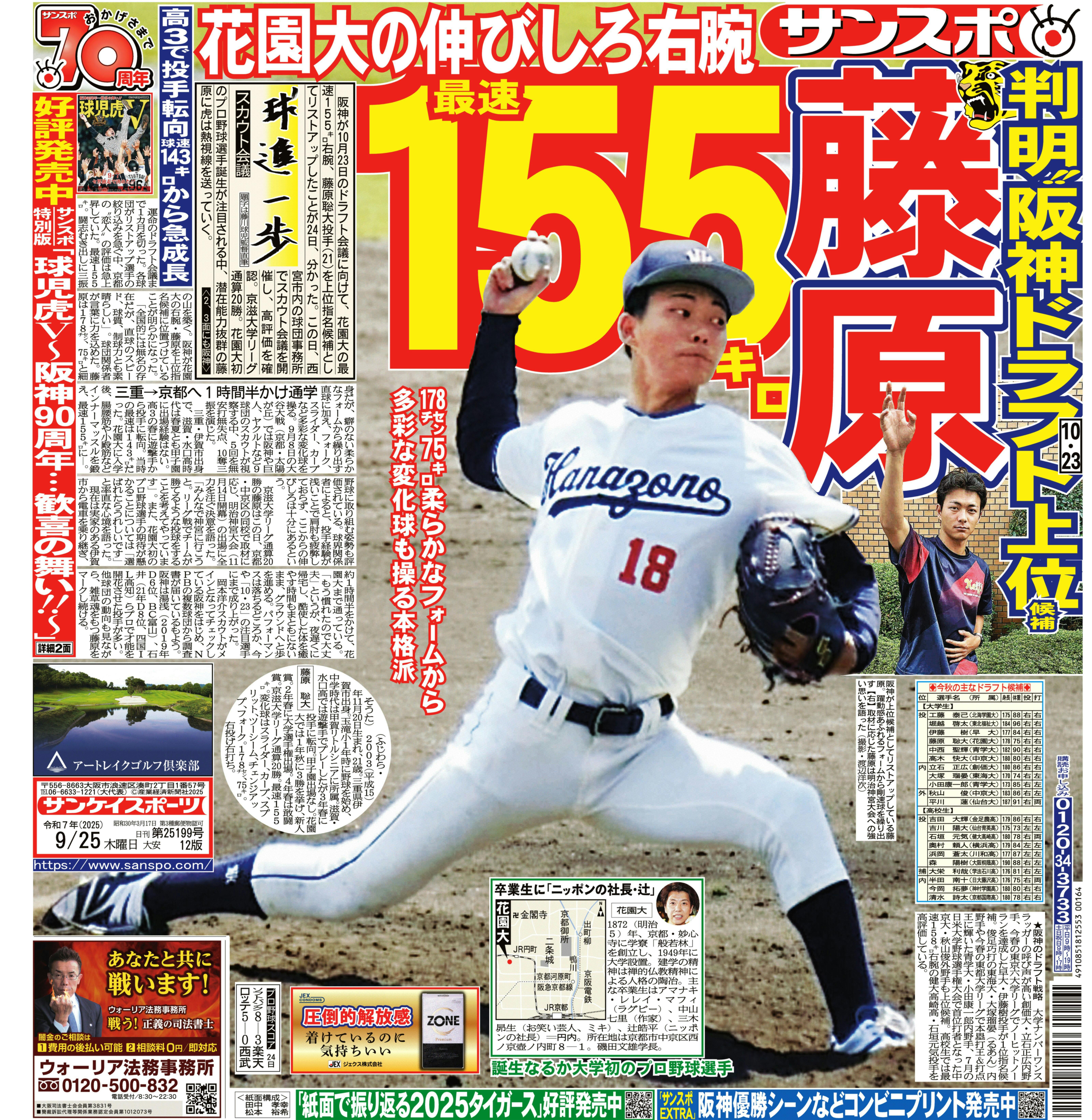 25日付のサンケイスポーツ1面は「判明!阪神ドラフト上位候補 藤原 最速155キロ 花園大の伸びしろ右腕」