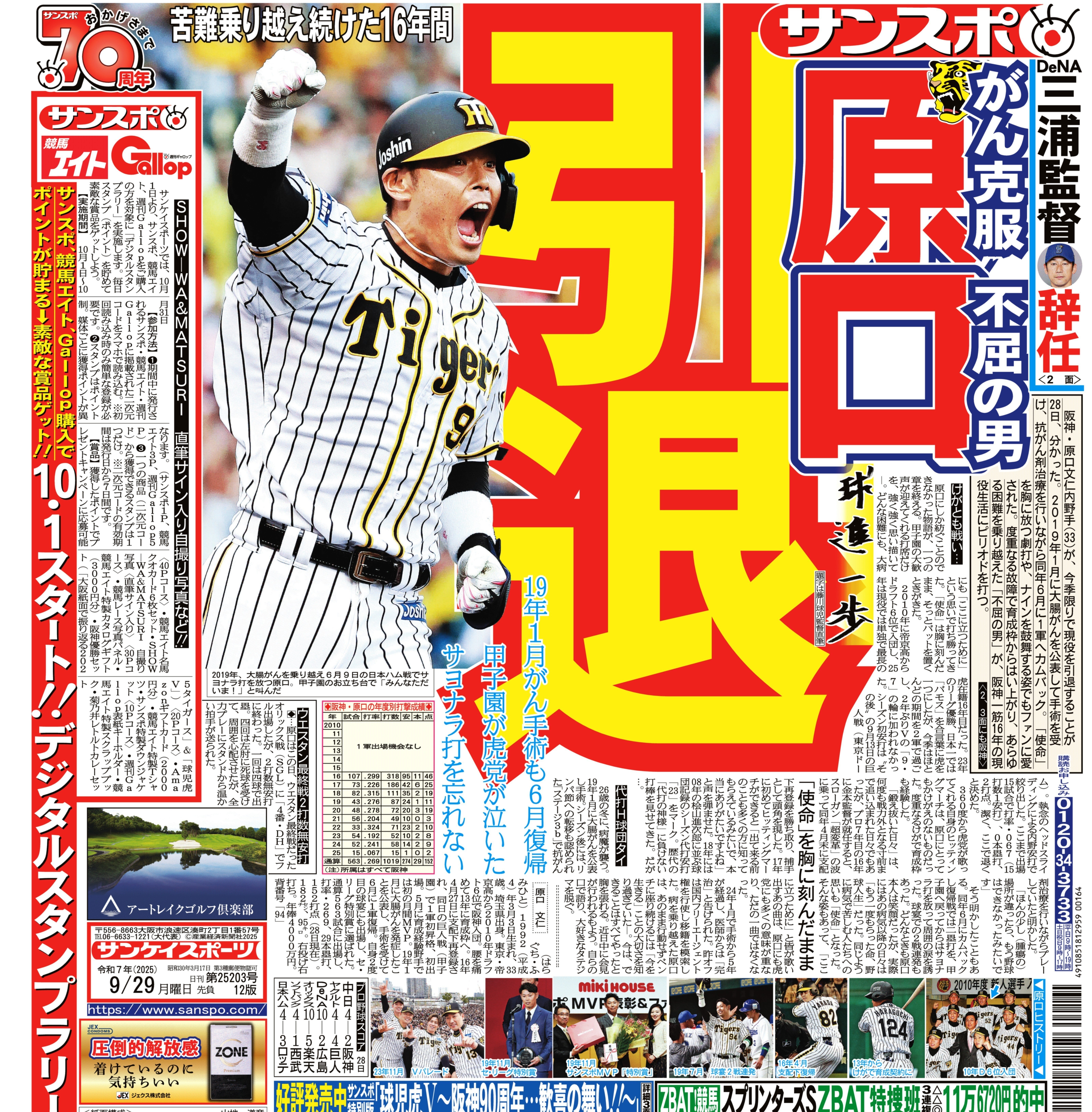 28日の阪神は中日に逆転負け。しかし及川雅貴投手がプロ野球新記録となる18試合連続ホールドを達成。藤川球児投手の記録が、また教え子に抜かれました。しかし、教え子に抜かれていくのはうれしい限りでしょう。そして、寂しいニュースがありました。原口文仁選手が引退。がんから復活の二塁打は忘れることができません。感動しました。帝京高時代は、家族のサポートを受けて通学。埼玉から片道2時間でした。家に帰って来てからも父と打撃特訓。本当に努力の人でした。人柄もすばらしいですね。
