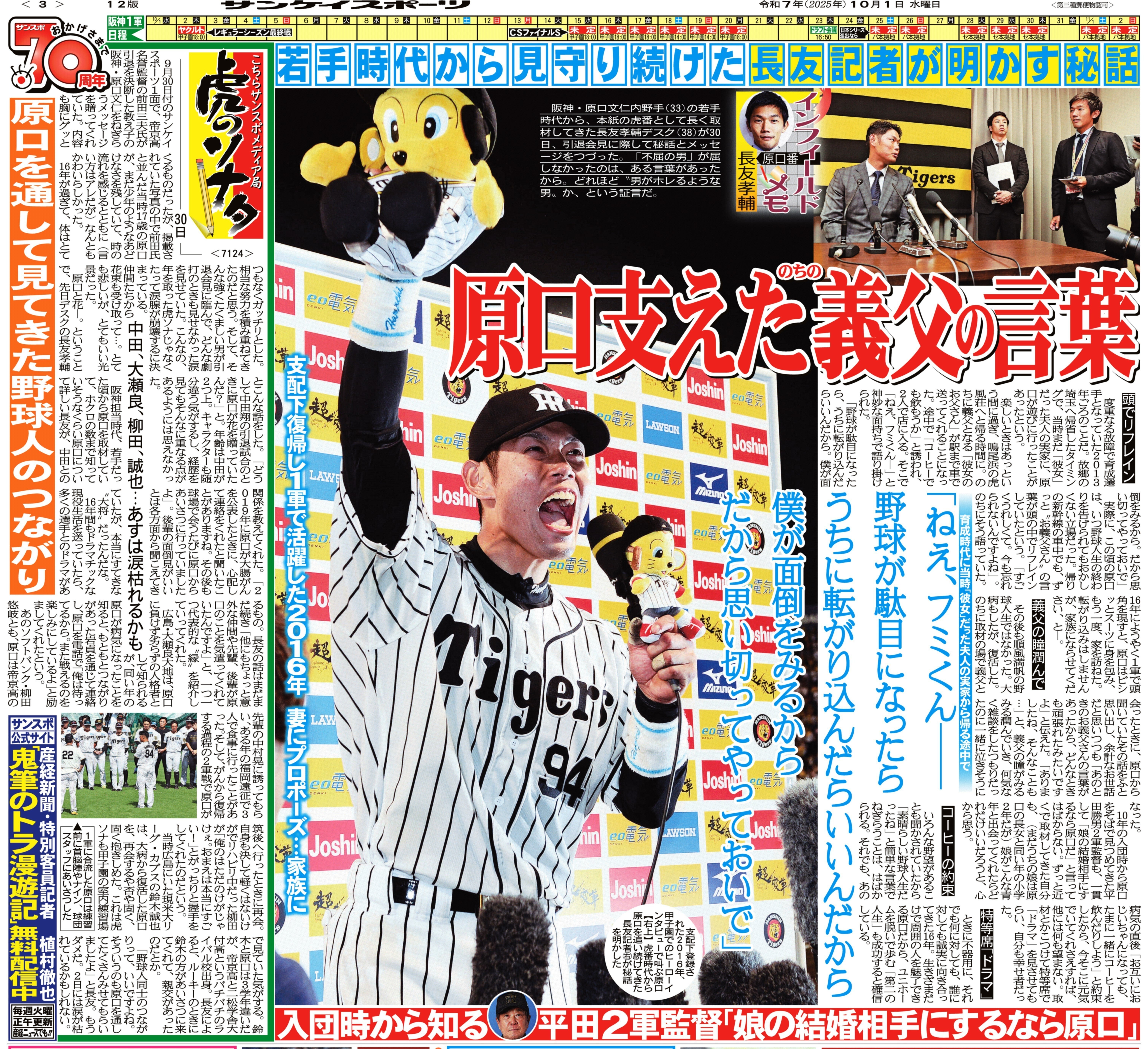30日は、阪神・原口文仁選手がユニホーム姿で引退会見。まだ終わっていない!日本シリーズで活躍する姿を見たいです。思わず流した涙には、グッと来ました。そして、サンケイスポーツ3面に、原口選手の秘話が。のちに義父となる「彼女のお父さん」が、まだうだつが上がらない頃の原口選手に「野球が駄目になったら、うちに転がり込んだらいいんだから。僕が面倒をみるから。だから思い切ってやっておいで」と語ったのです。まだ1軍で活躍する3年前ですからね。義父も惚れてしまう人格者なんでしょう。プレーにも、人柄がにじみ出ています。サンスポ3面には原口選手の人柄が詰まっているので、ぜひ、ご一読ください。