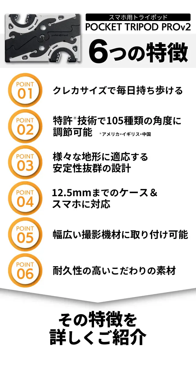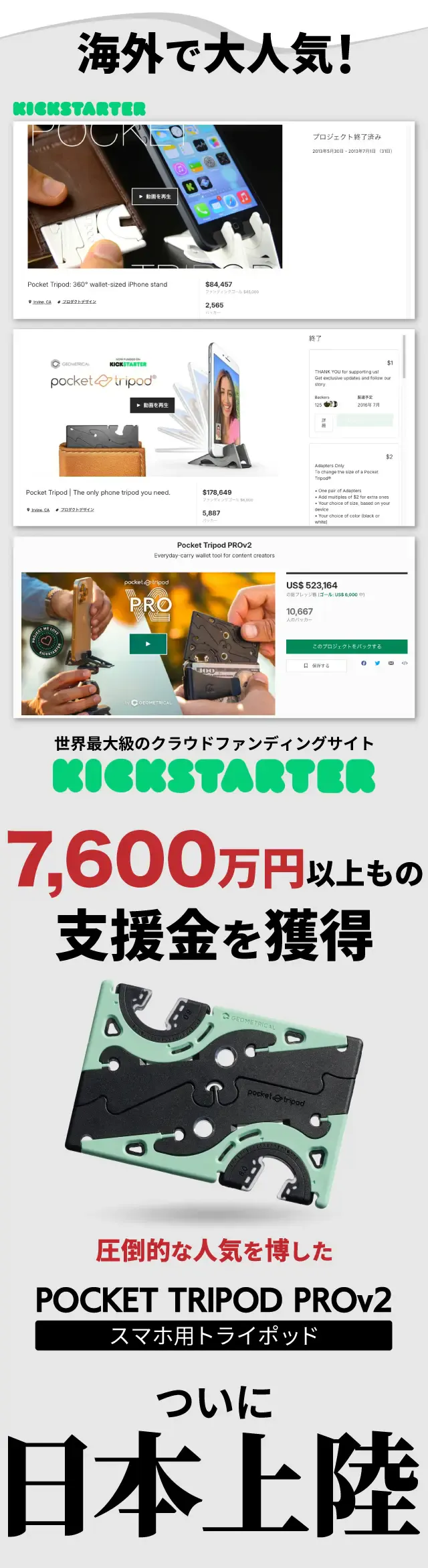 Pocket Tripod PROv2は、カリフォルニア州南部を拠点とするプロダクトデザイン会社「Geometrical(ジオメトリカル)」が開発した、米国・英国・中国で特許取得済みのスマホスタンドです。