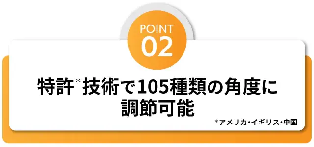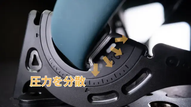 このメカニズムは、スプリング内蔵の放射状レール(自己潤滑性ポリマー製)を滑らかに動かす設計となっており、前後それぞれ105°のシームレスな角度調整が可能です。