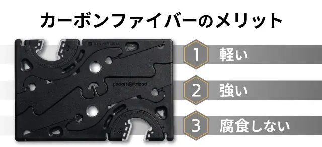 Pocket Tripod PROv2の脚部は、カーボンファイバー(炭素繊維)製フレームを採用しています。これにより、必要な剛性を保ちながら、余分な重量を抑えた軽量設計を実現しています。