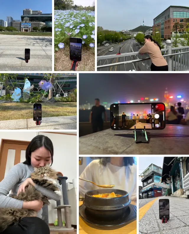 スマホホルダーとして、風景撮影、自撮り、ジムやゴルフ練習場でのフォーム撮影、釣りの記念写真、ZOOM会議、動画視聴など日常のちょっとした時にすぐ取り出して使うことができるので、我々も毎日持ち歩いています。