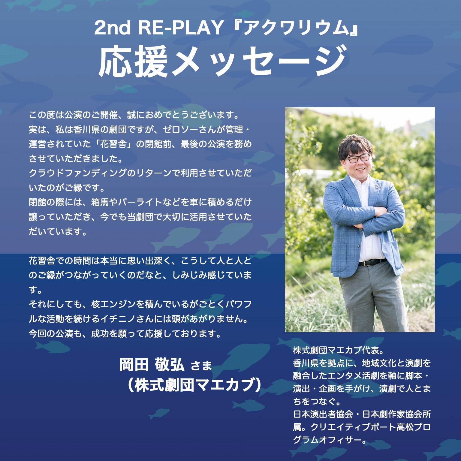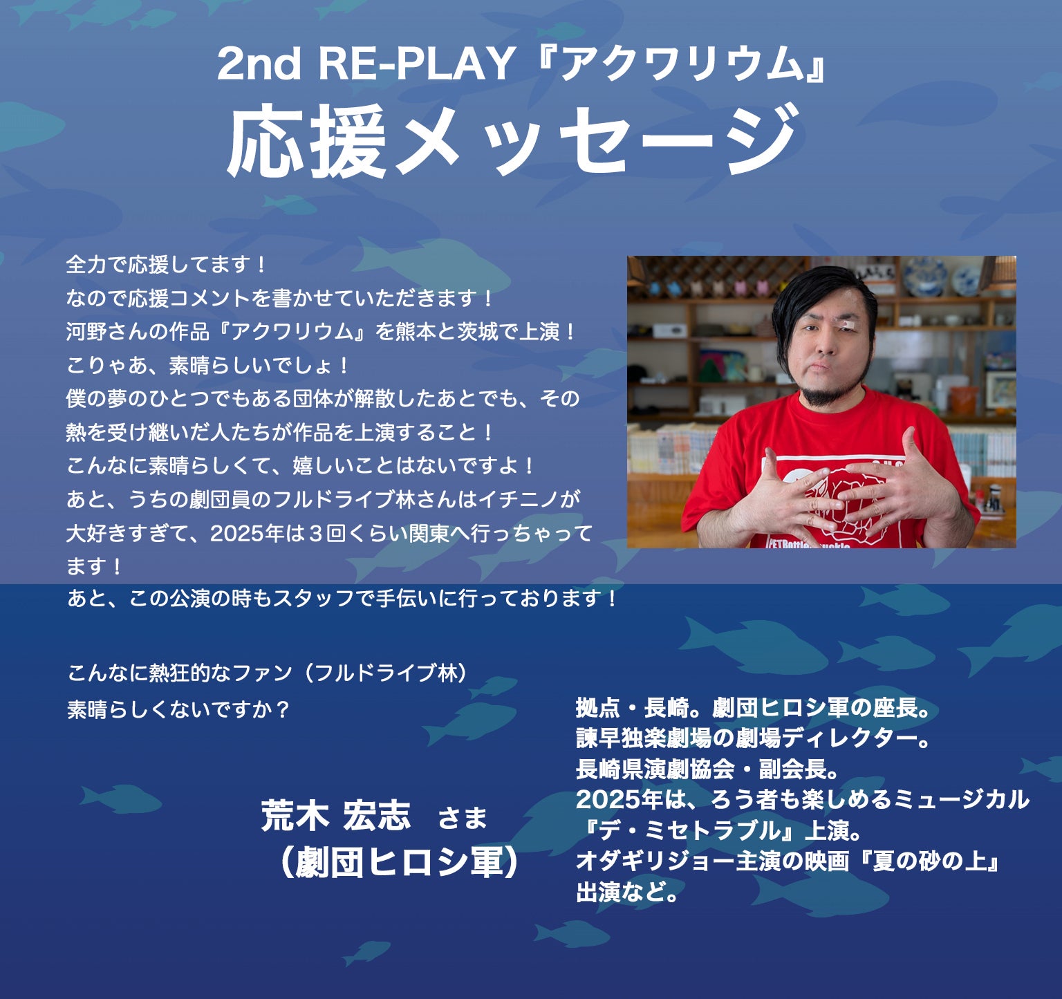 2026/01/29 18:472nd RE-PLAY『アクワリウム』応援メッセージ 河野ミチユキ氏やイチニノにゆかりのある全国の皆様から、応援メッセージを頂いています。ぜひ皆様も応援よろしくお願いします!【19】泊 篤志 さま (飛ぶ劇場)泊さま、ありがとうございます! もっと見る