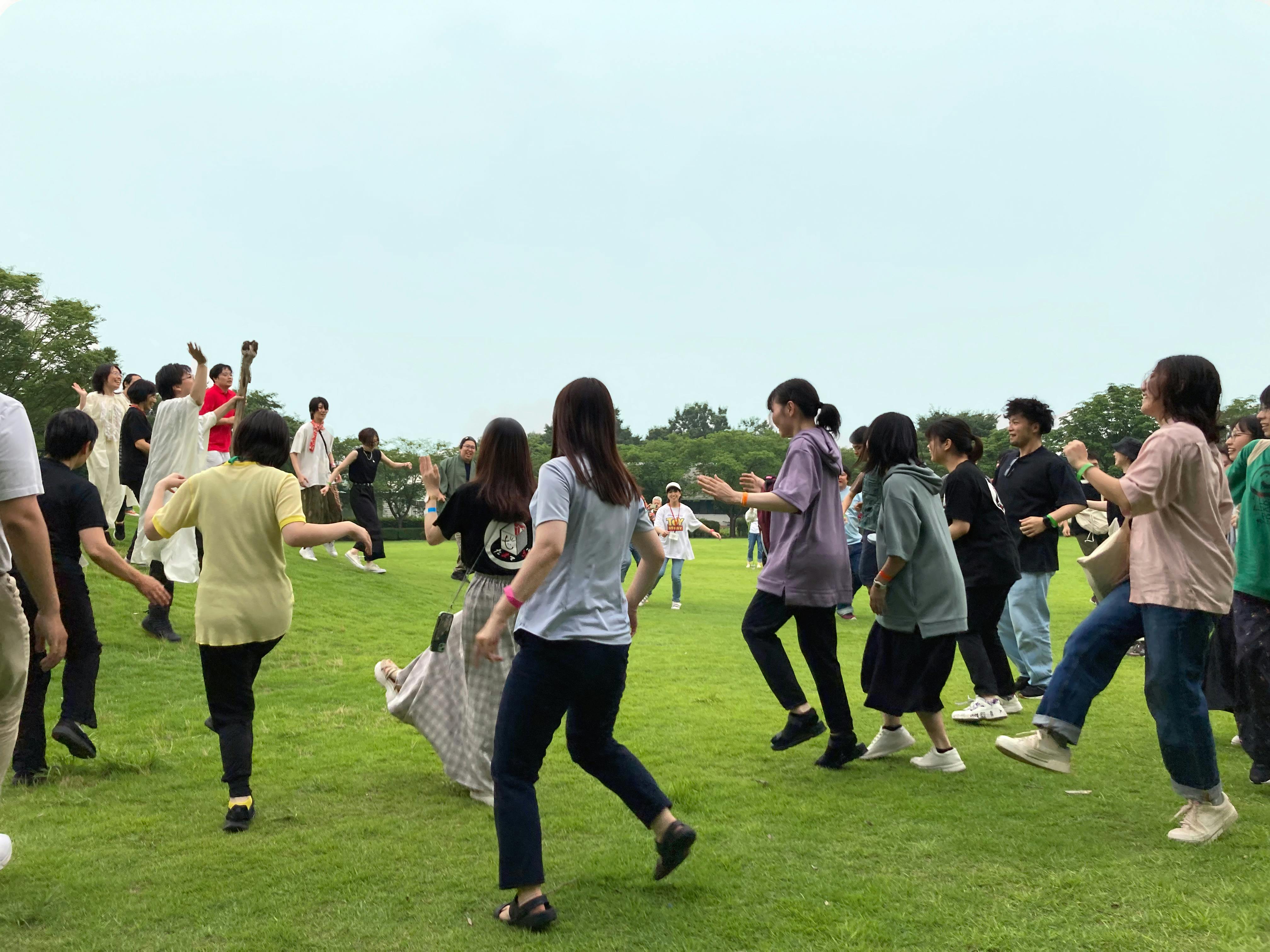 演劇祭の全体企画「超高速マイムマイム」を皆で踊る