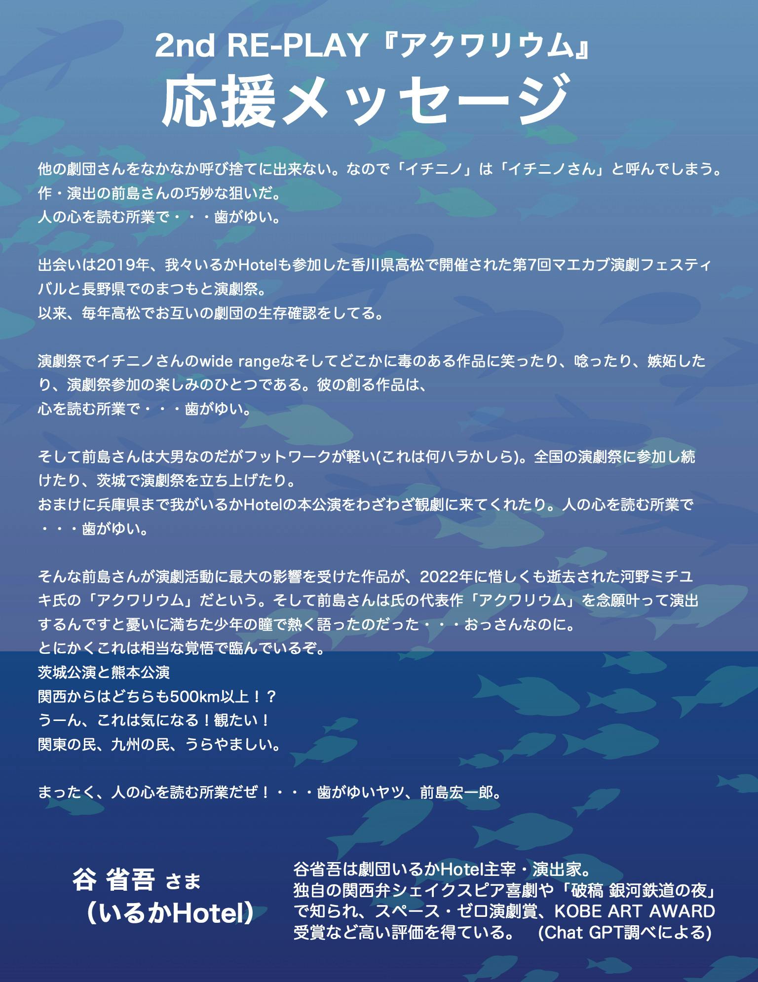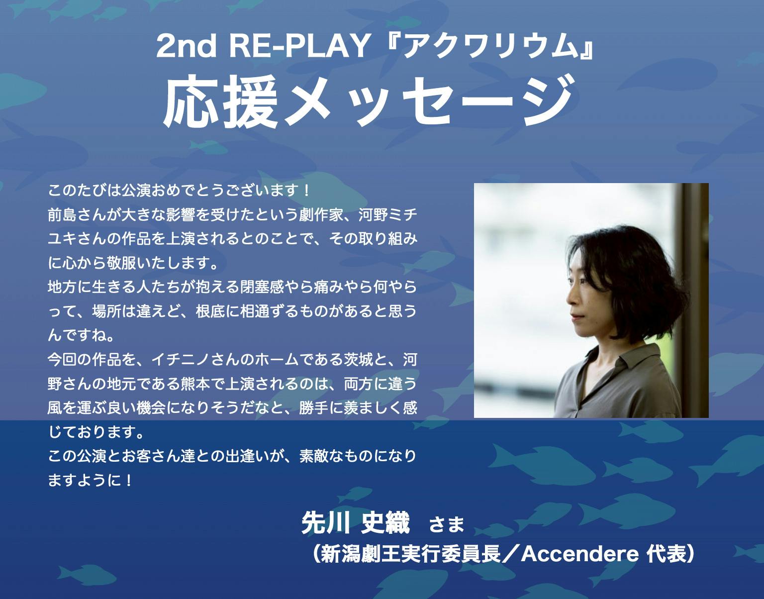 2025/12/28 10:002nd RE-PLAY『アクワリウム』応援メッセージ 河野ミチユキ氏やイチニノにゆかりのある全国の皆様から、応援メッセージを頂いています。ぜひ皆様も応援よろしくお願いします!【13】中嶋 かねまさ さま (劇団ハンニャーズ)中嶋さま、ありがとうございます! もっと見る