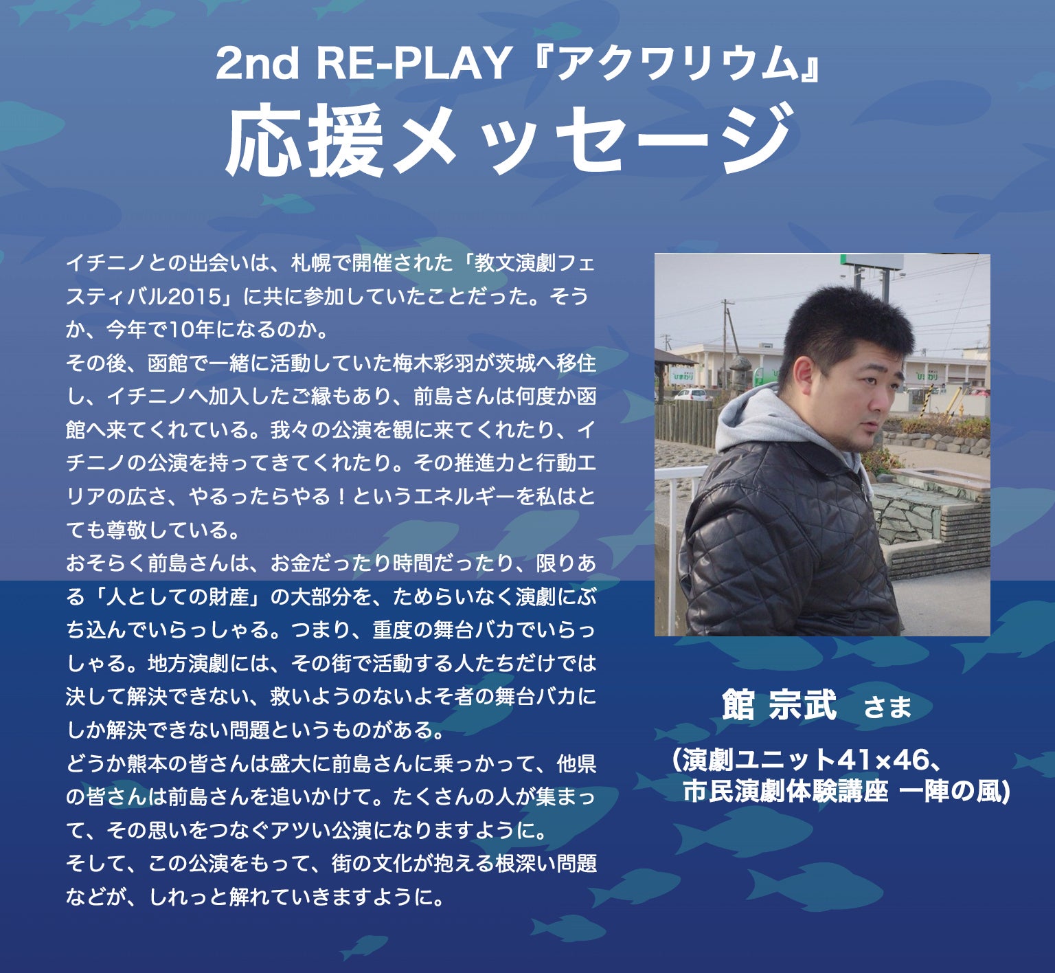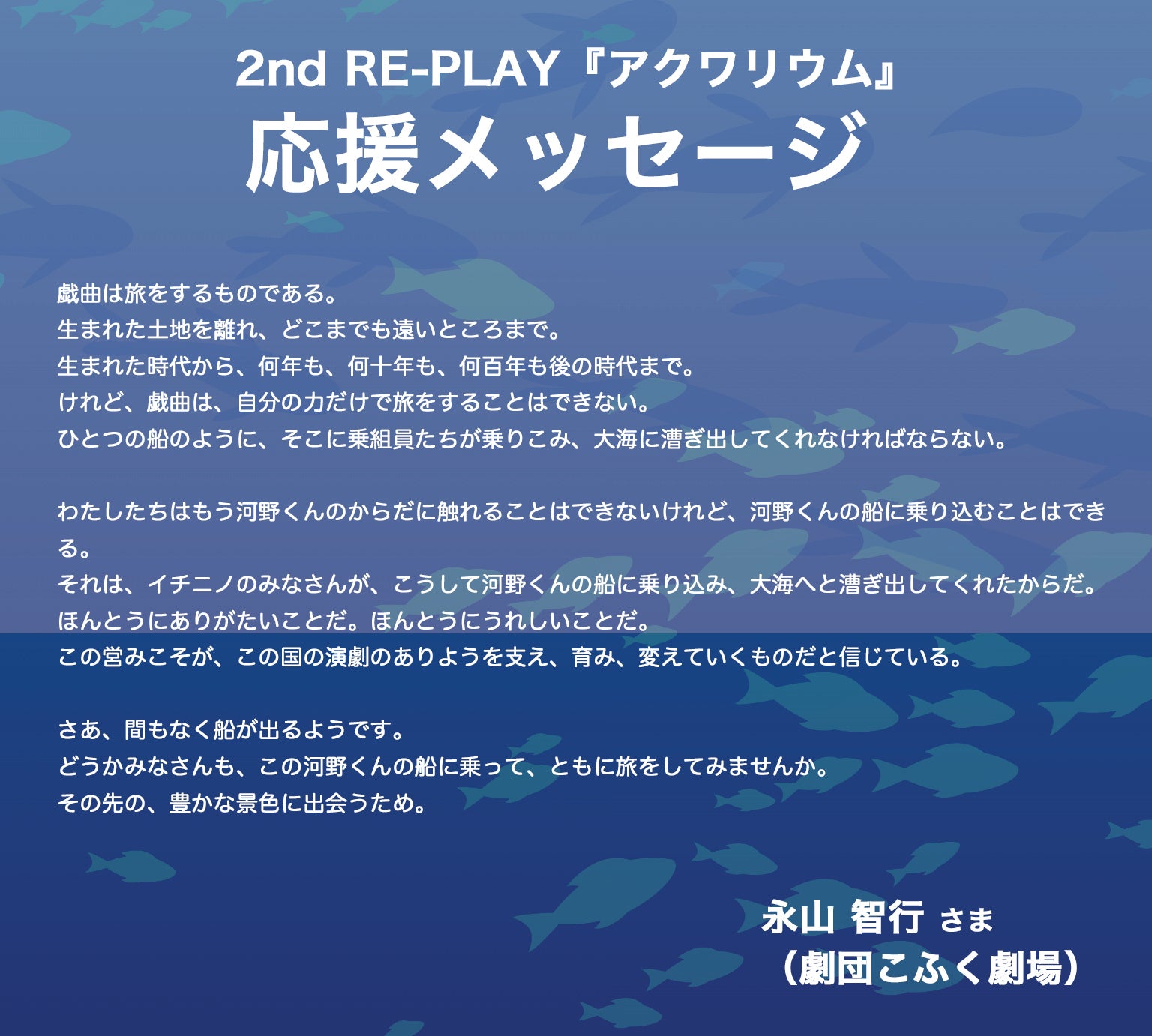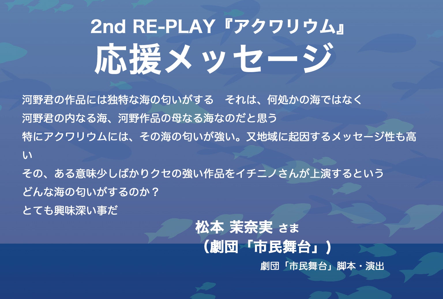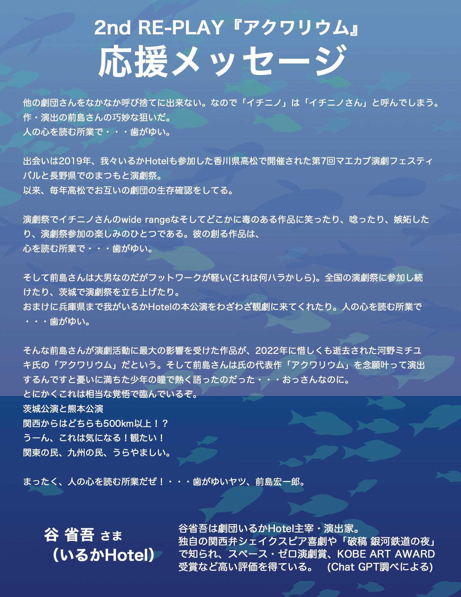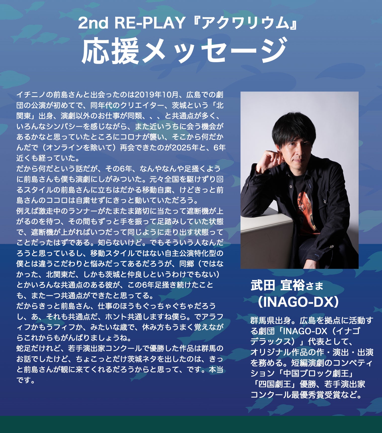 2026/01/29 18:472nd RE-PLAY『アクワリウム』応援メッセージ 河野ミチユキ氏やイチニノにゆかりのある全国の皆様から、応援メッセージを頂いています。ぜひ皆様も応援よろしくお願いします!【19】泊 篤志 さま (飛ぶ劇場)泊さま、ありがとうございます! もっと見る