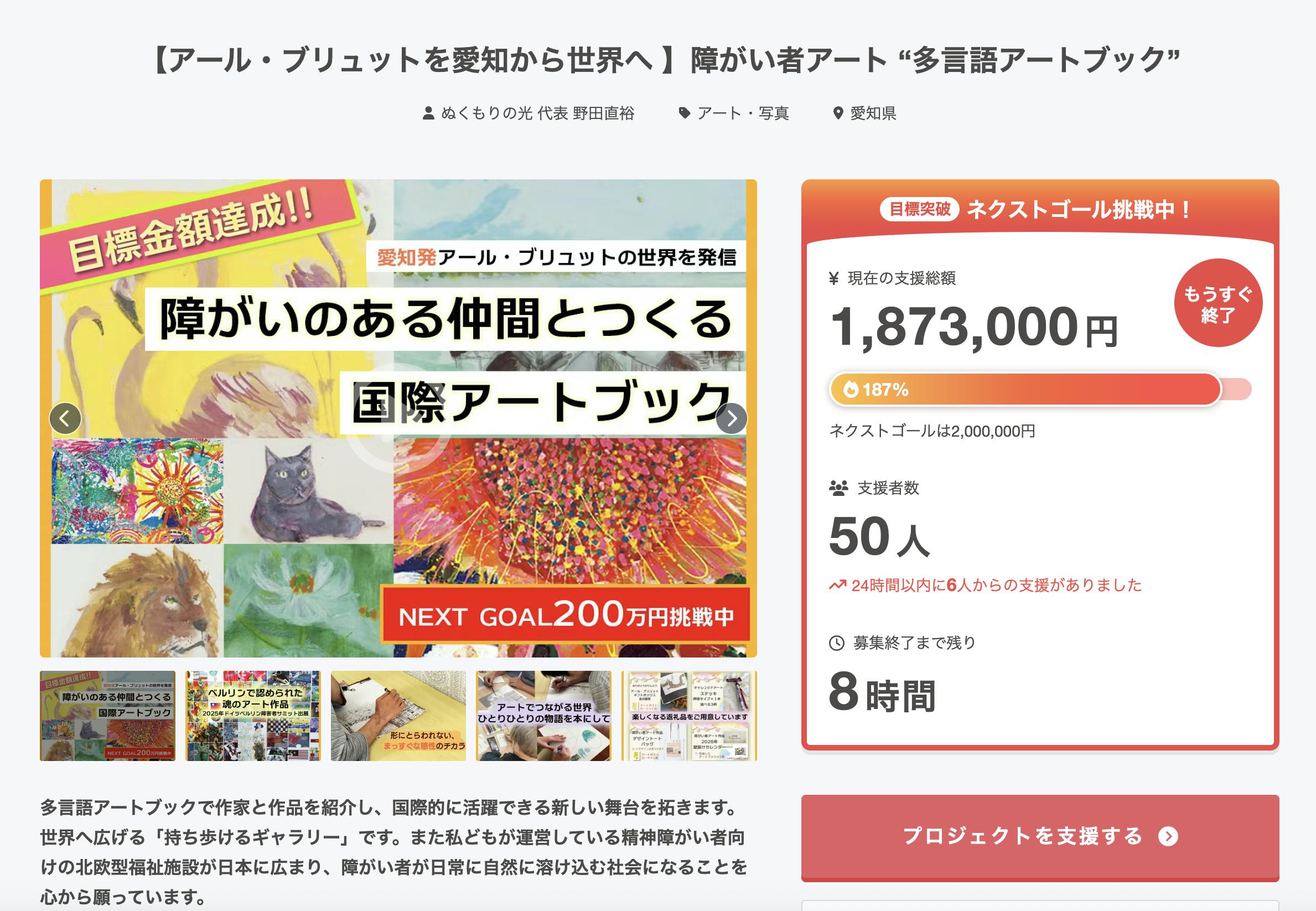 今は障害者アートの普及に尽力されており、このクラウドファンディングを通して、障害者アートの認知が広がってほしいです。