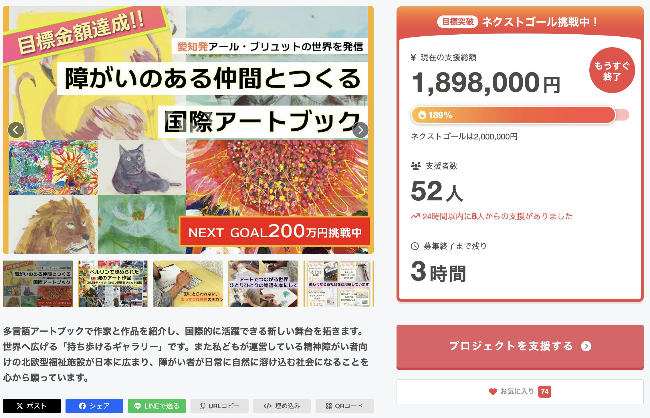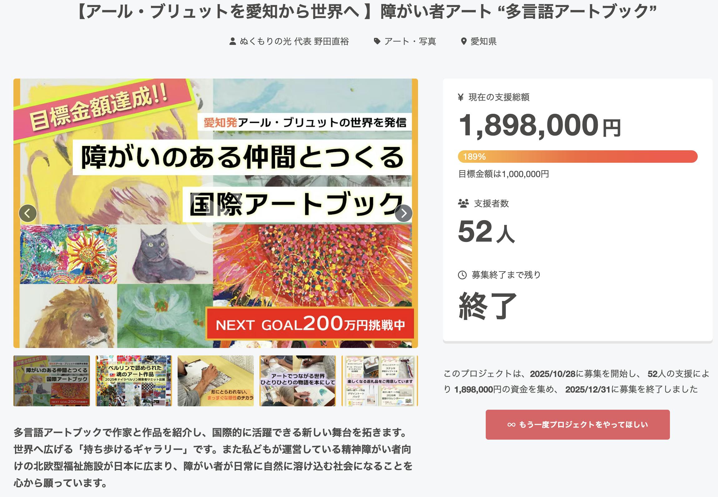 2026/01/01 22:18【ご報告と感謝】障がいのある仲間とつくる多言語アートブックのクラウドファンディングが無事終了しました。ご支援総額:1,898,000円目標達成率:189%支援者数:52名心から感謝申し上げます。愛知から世界へ。アール・ブリュットの可能性を本という「持ち歩けるギャラリー」にして届ける挑戦が、確かな一歩になりました。この成果を、次は・国際展示・医療×福祉×アートの連携・北欧型福祉モデルの発信へとつなげていきます。応援してくださった皆さま、本当にありがとうございました。 もっと見る