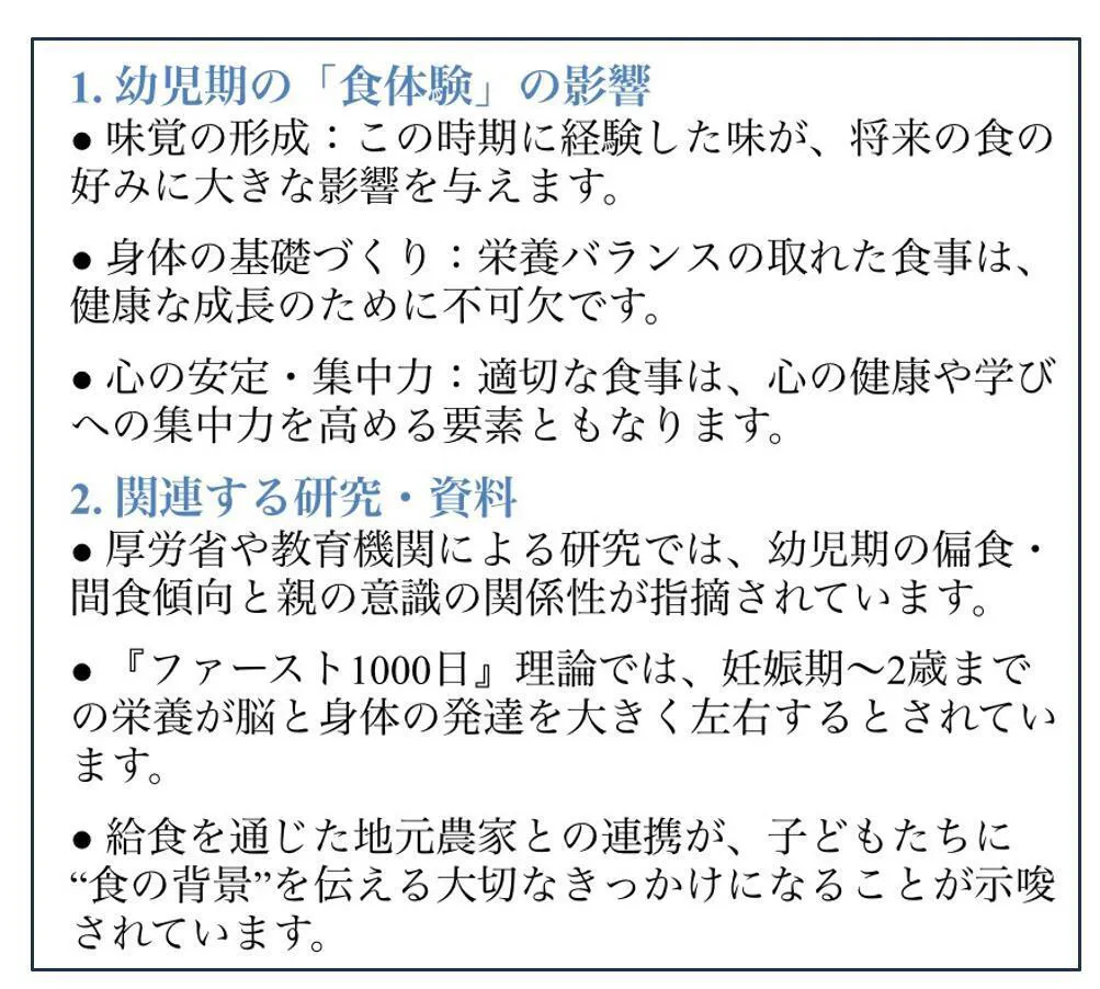 "幼児期の食体験は子どもたちの成長や人生に大きく関わっている"