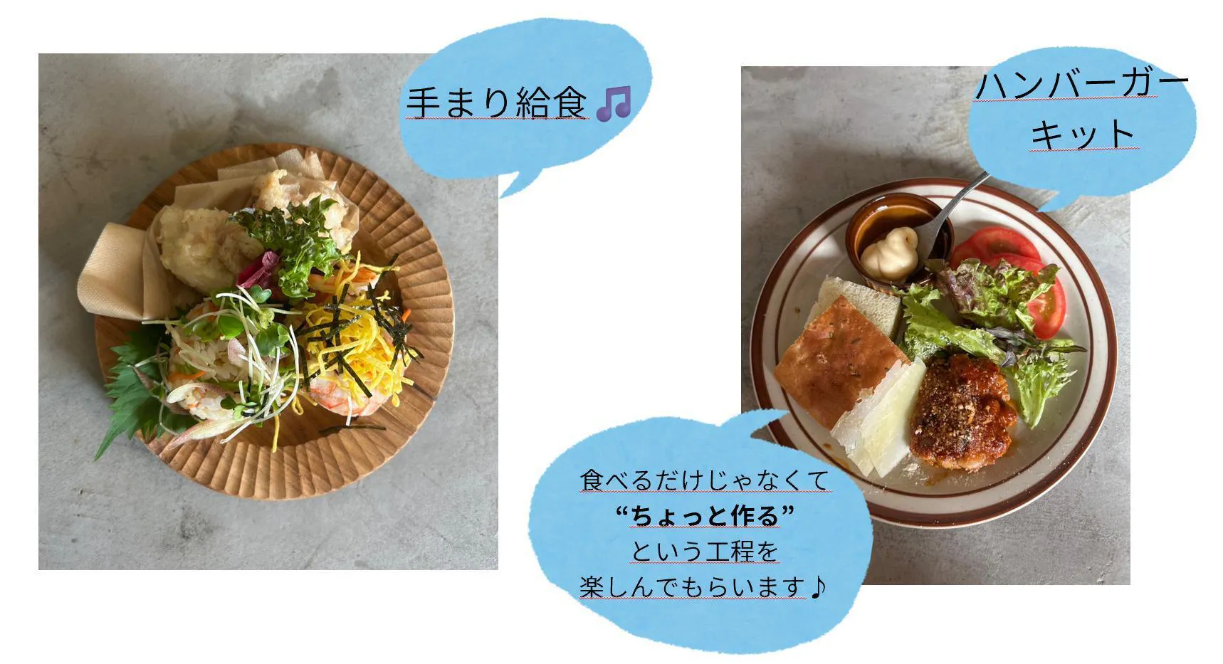 ハンバーガーの日はバンズと具材をキットにして、子どもたちが自分の手で「最後の仕上げ」をすることで、こんな学びが自然と身についていきます。