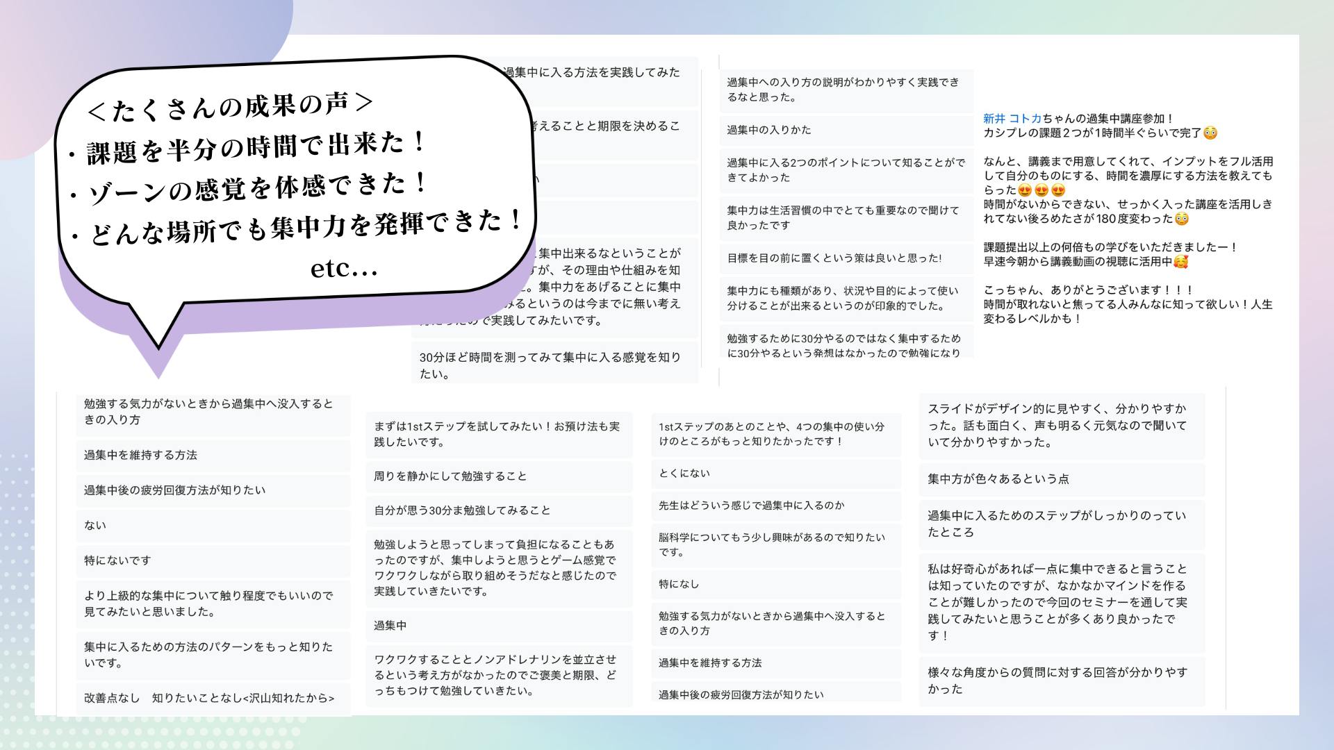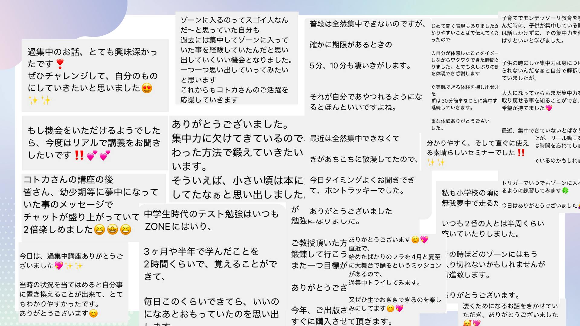 『過集中メソッド』は読むだけでなく、実際に使ってこそ力を発揮します。そのために私は、出版に合わせて「過集中講座」も展開しています。実際に受講した方からは、「いつもより集中できた!」「30分で2時間分の仕事ができるようになった」「ゾーンの感覚を体感できた!」集中が続かない人も、自分の“集中スイッチ”を見つけられるようになり、過集中で燃え尽きてしまう人も、持続型の集中を身につけられるようになりました。