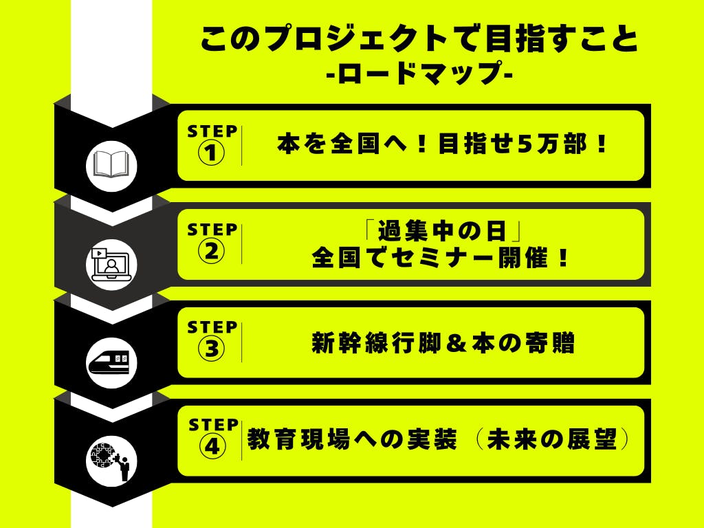 そして、訪れる街の 図書館・福祉施設・地域団体等へ『過集中メソッド』本を贈ります。まずは25駅で合計300冊。さらにストレッチゴールでは、全国95駅をめぐり、1000冊を届け広げます。