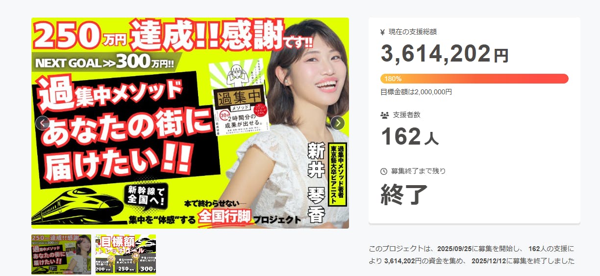 2025/12/17 09:31「新幹線で全国行脚!本で終わらせない!『過集中メソッド』をあなたの街に。」プロジェクトオーナーの新井 琴香です。12月12日、感謝感激のドラマの中、クラファンが無事終了しました!目標額200万円を大きく上回り、達成率180%、360万円超、ご支援者162名!感動です!ご支援くださった皆様、それまでサポートしてくださった皆様。本当にありがとうございました。全ての人に感謝です。支援総額:3,614,202円支援者数:162※詳細はこちらからご覧いただけます。https://camp-fire.jp/projects/877669/viewこのプロジェクトは「お金を集めること」が目的ではなく、集中の輪で、人と出会い、つながり、未来を動かすことが目的でした。それが今回、こうして“形”になったこと、本当にうれしく思っております。今後、支援者の皆様へは順次リターンのご対応をさせていただきます。少しお時間を頂くかと思いますが、是非楽しみにお待ちいただけたらと思います。改めて、ご支援いただきまして誠にありがとうございます。新井琴香 もっと見る