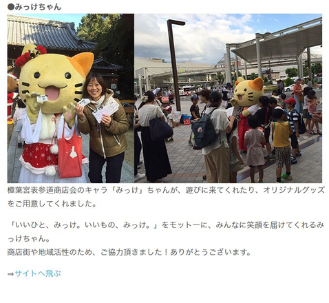 樟葉宮表参道商店会のキャラ「みっけ」ちゃんが、遊びに来てくれたり、オリジナルグッズをご用意してくれました。