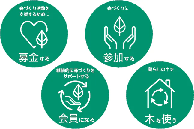 「花粉の少ない森づくり運動」では、地球温暖化防止に貢献しながら、健康な森を未来に引き継いでいくため、多くの方のご支援・ご参加をお待ちしています。
