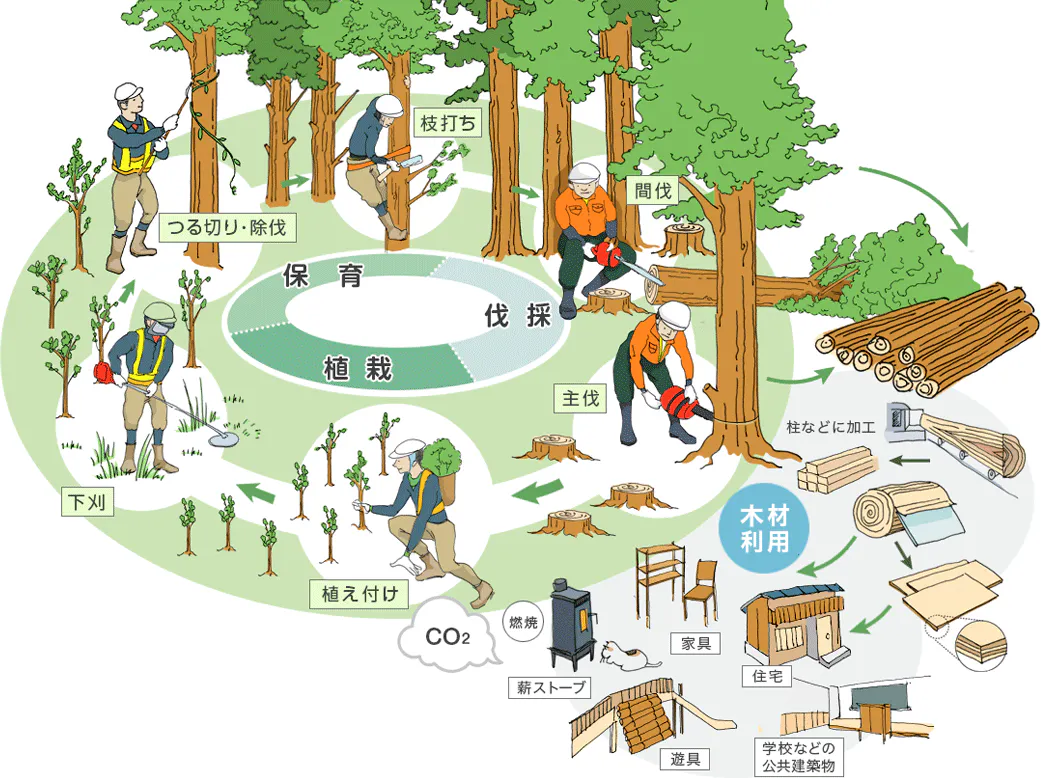 太く丈夫な木が育ち、たっぷりと水を貯えることができる健康な森を保つためには、森の手入れが欠かせないのです。大きくなった木は伐採して使い、伐採したあとには苗を植えて育てることを繰り返す「森の循環」がとても大切です。
