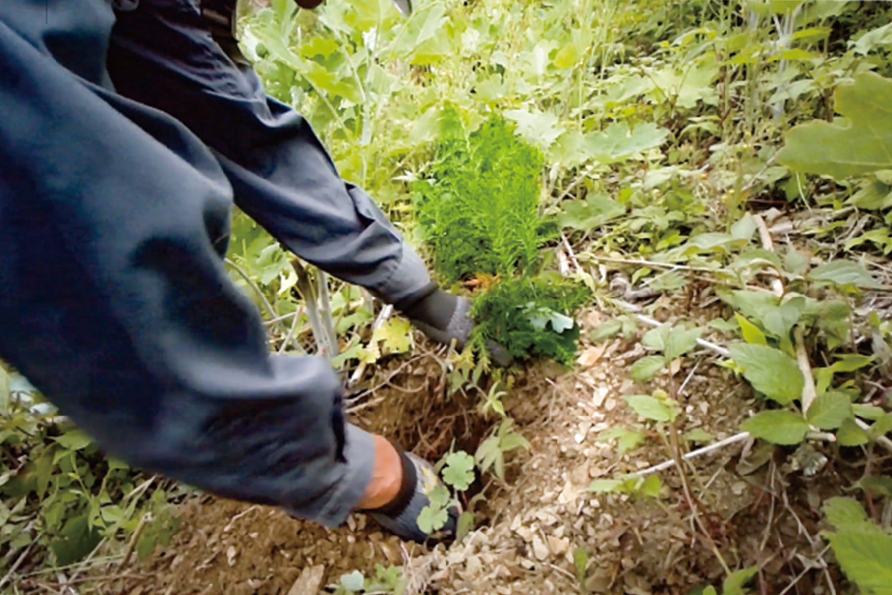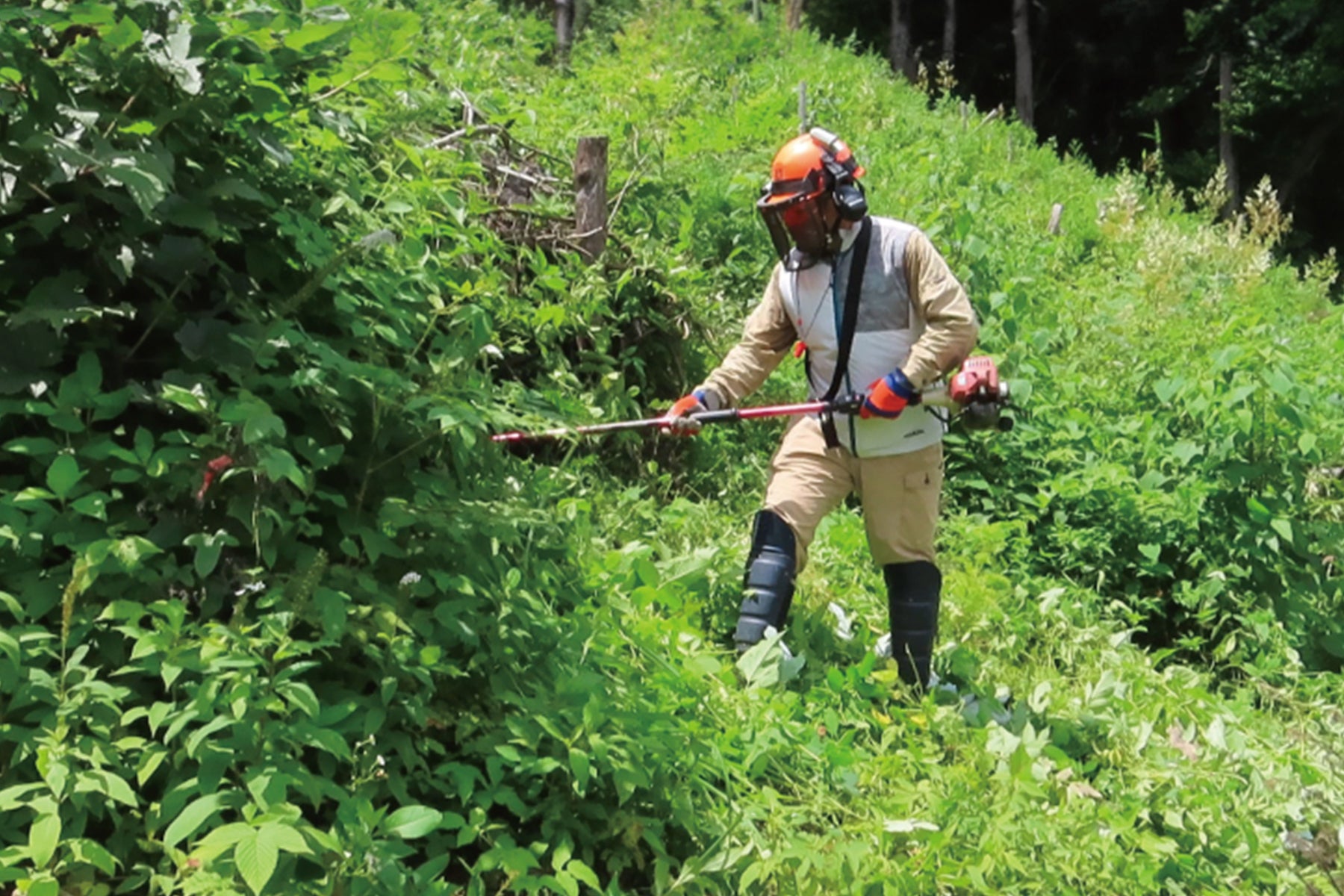 花粉の少ないスギ・ヒノキが雑草に負けないぐらい大きく育つまで、真夏には草刈りを行います