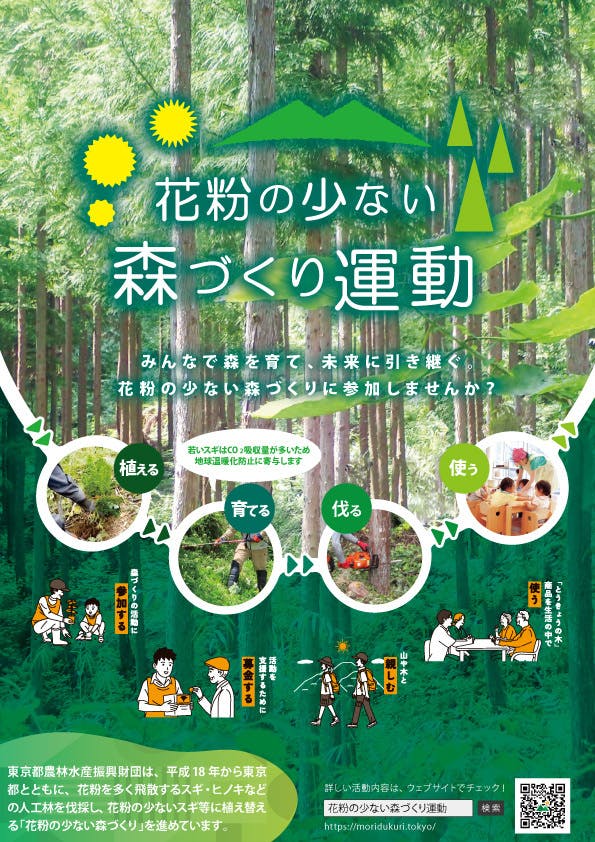公益財団法人東京都農林水産振興財団は、2006年から花粉を多く飛散するスギ・ヒノキの人工林を伐採し、花粉の少ないスギ・ヒノキなどに植え替える「花粉の少ない森づくり」を進めています。これにより、花粉症の原因となる花粉を減らし、あわせて、森の循環を促進し、木材の安定供給と林業の活性化を図っています。