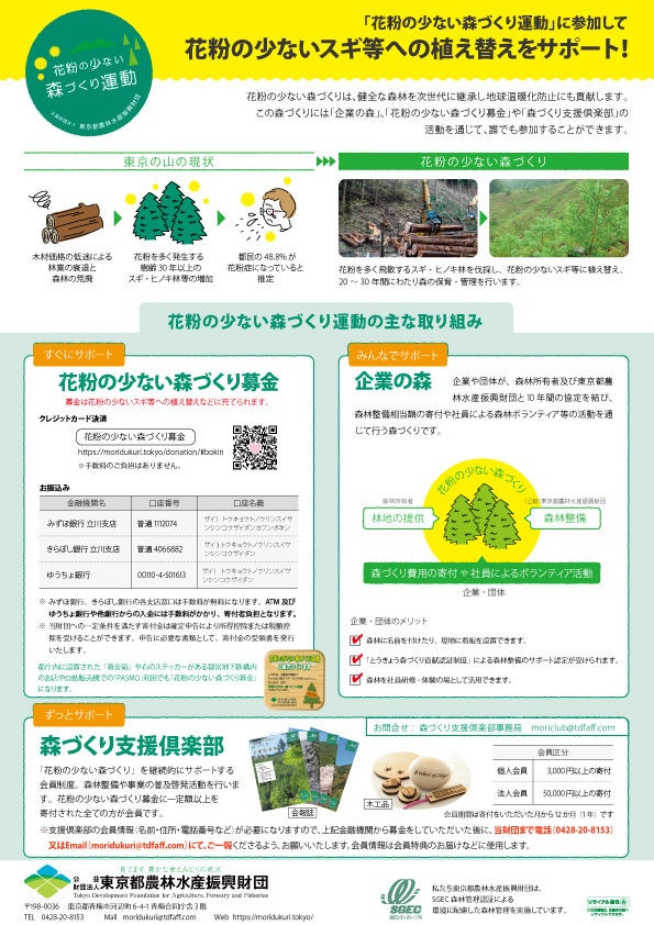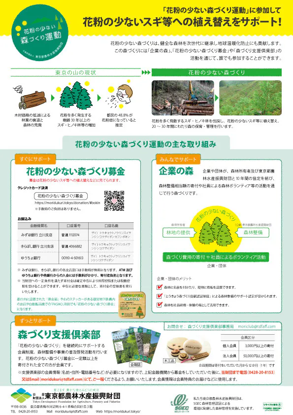 また、ご寄付をいただけますと、花粉の少ない森づくりに向けた「森づくり支援倶楽部」に1年間、会員として取り扱いさせていただきます。