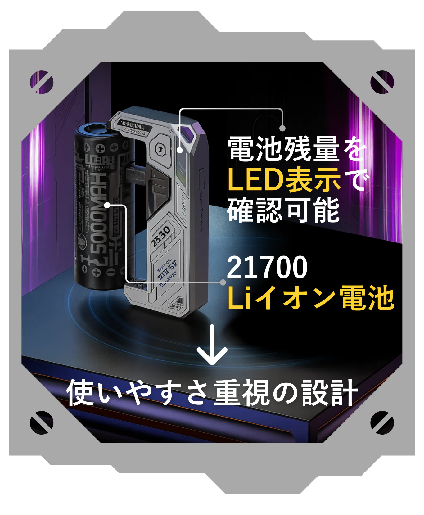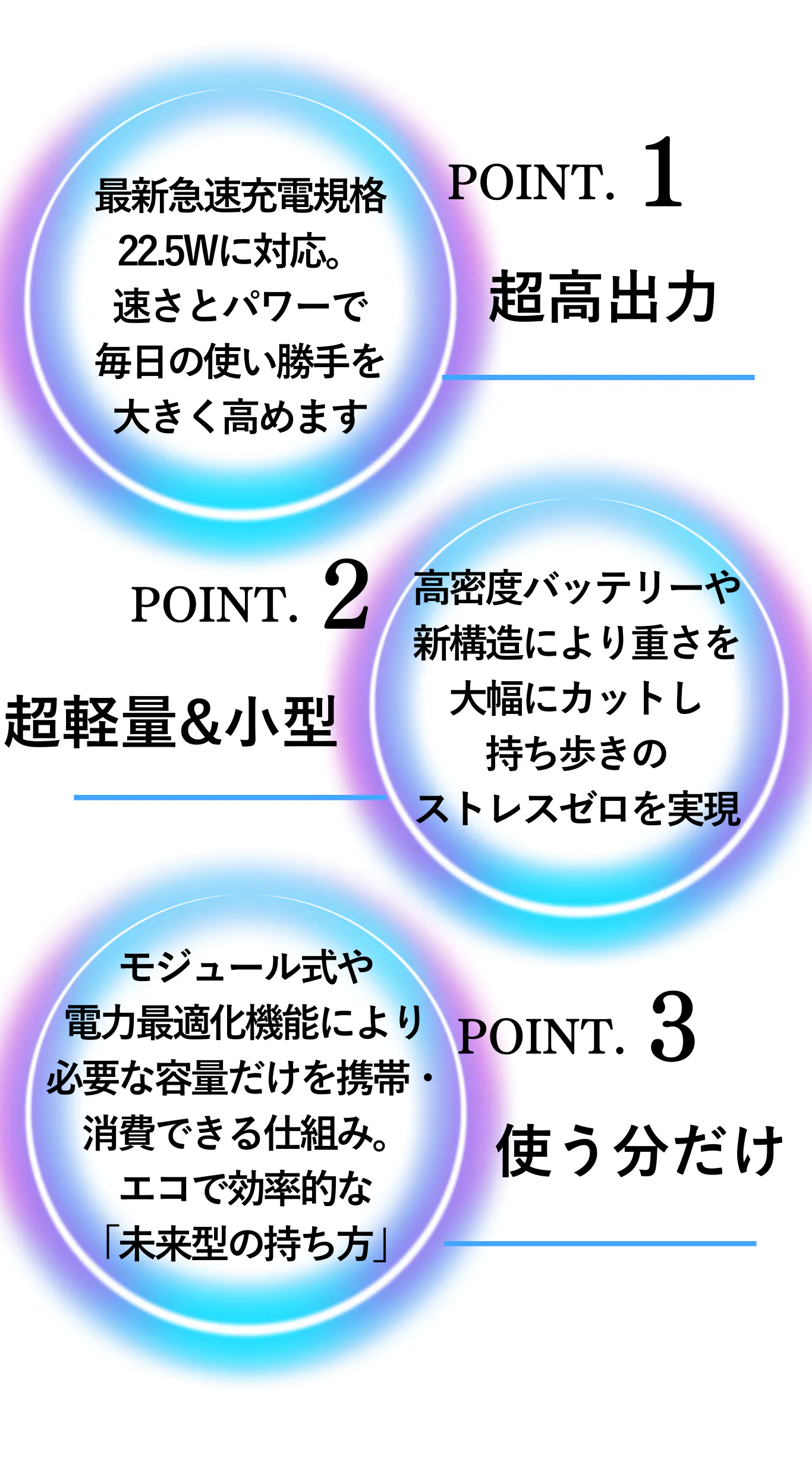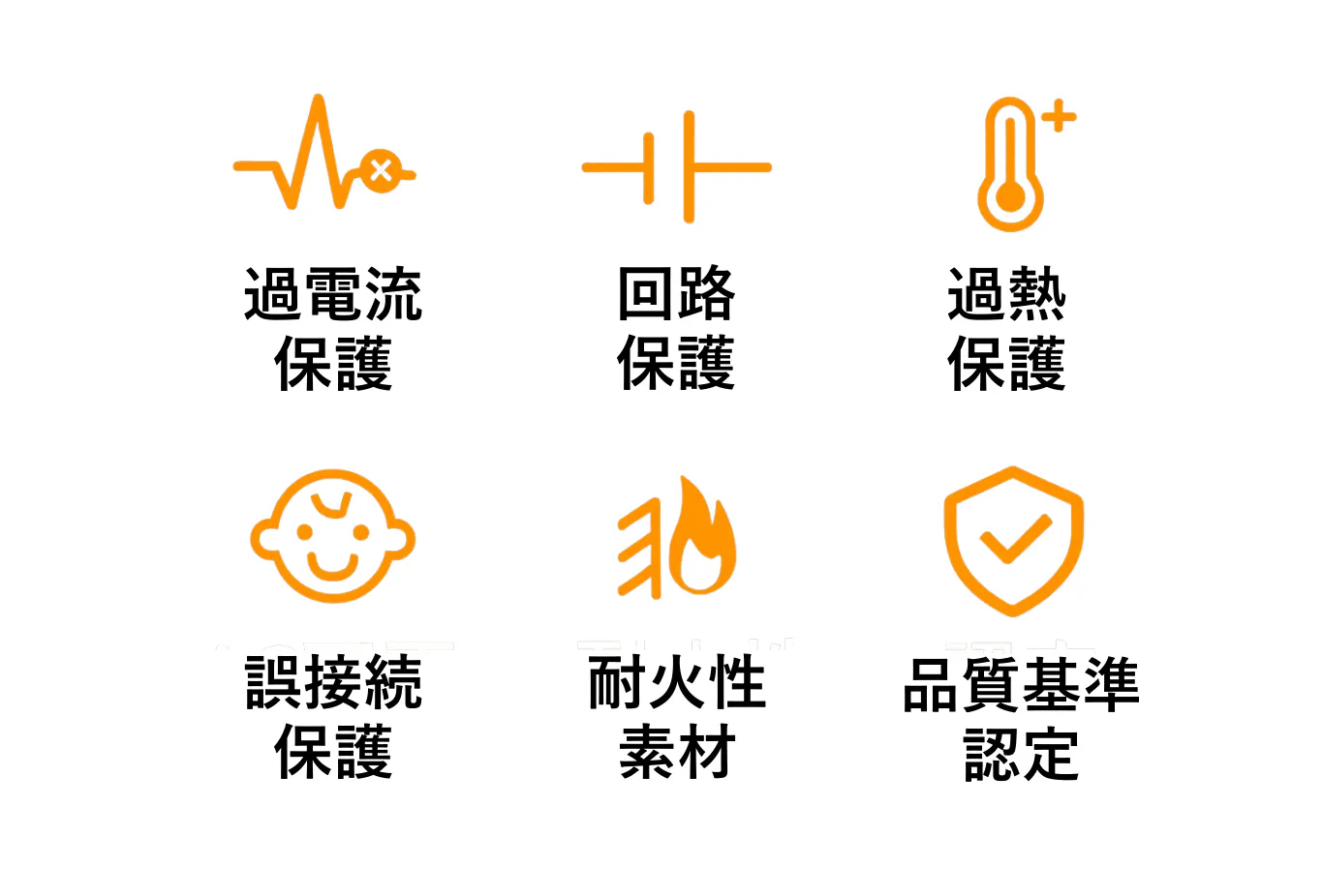 過充電・過放電保護/出力短絡保護/過熱保護/低電圧保護/高効率だけでなく、徹底した安全設計であなたのデバイスを守ります。