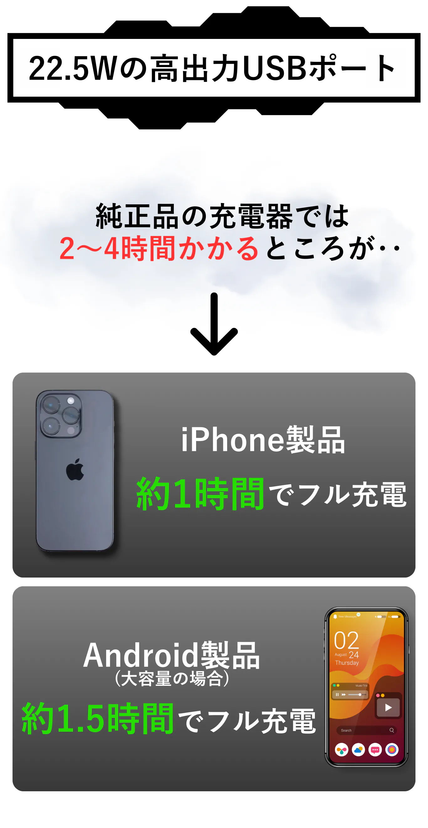 ✅ 高出力 22.5Wで圧倒的スピード充電