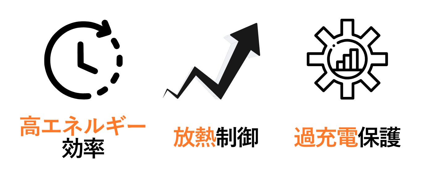 過充電・過放電保護/出力短絡保護/過熱保護/低電圧保護/高効率だけでなく、徹底した安全設計であなたのデバイスを守ります。