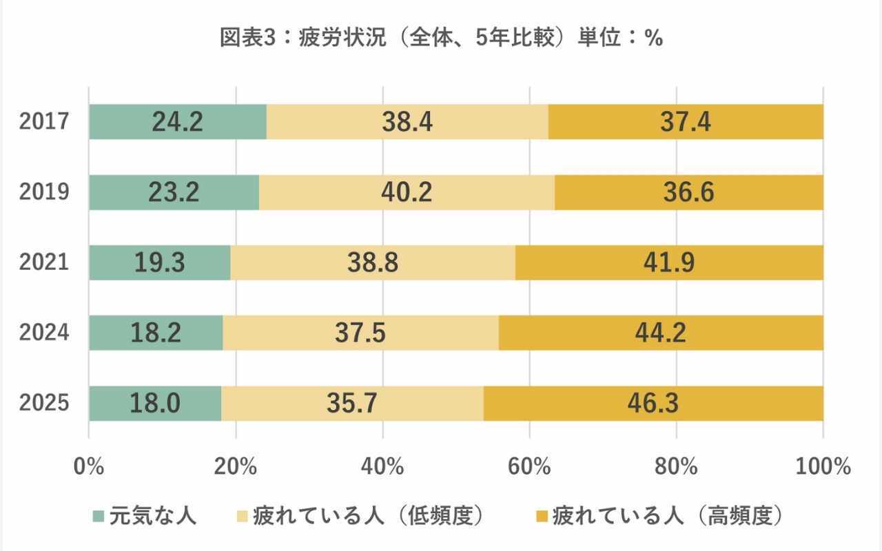 一般社団法人日本リカバリー協会が日本全国10万人を対象に行なった2025年版の調査結果によると、調査をスタートした2017年以来「元気な人」の割合は低下し続け、2025年は過去最小の18%。それに反比例するように「高頻度で疲れている人」の割合は増加し続け、2025年は過去最高の46.3%にのぼります。