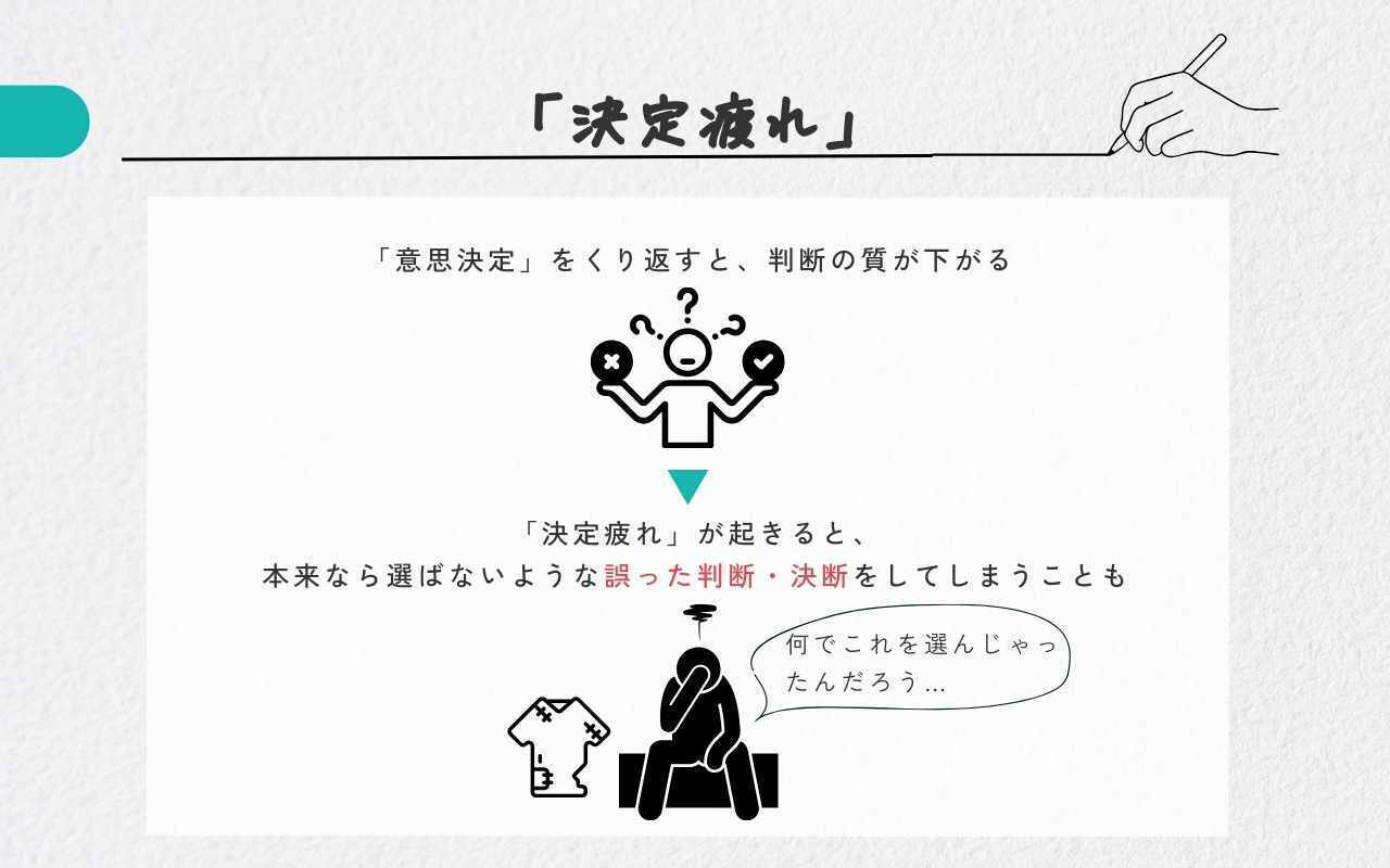 心理学では、人間は意思決定をくり返すほど判断の質が下がることが知られています。これは「決定疲れ(Decision Fatigue)」と呼ばれるものです。