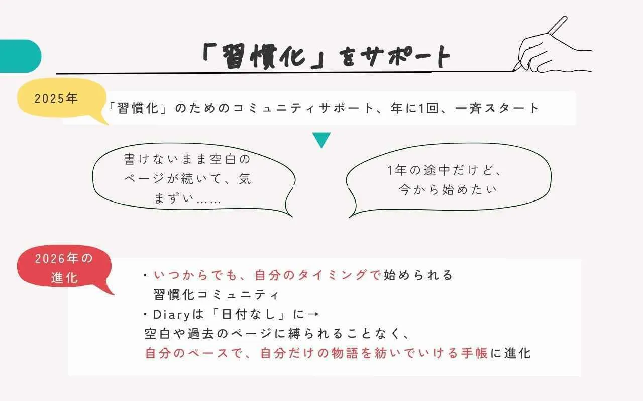 これまでのジャーナリングの習慣化のためのサポートは年始スタートのみでしたが、2026年からは「いつからでも」「自分のタイミングで」始められるしくみにアップデートします。