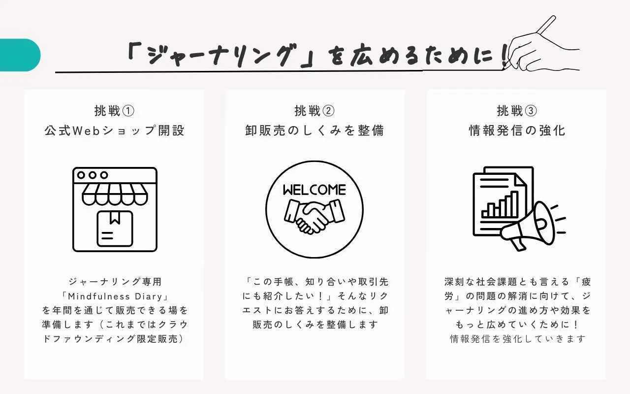 他にも「ジャーナリング」の進め方や可能性、体験談を、より多くの方に知ってもらうための発信活動も強化していきます。