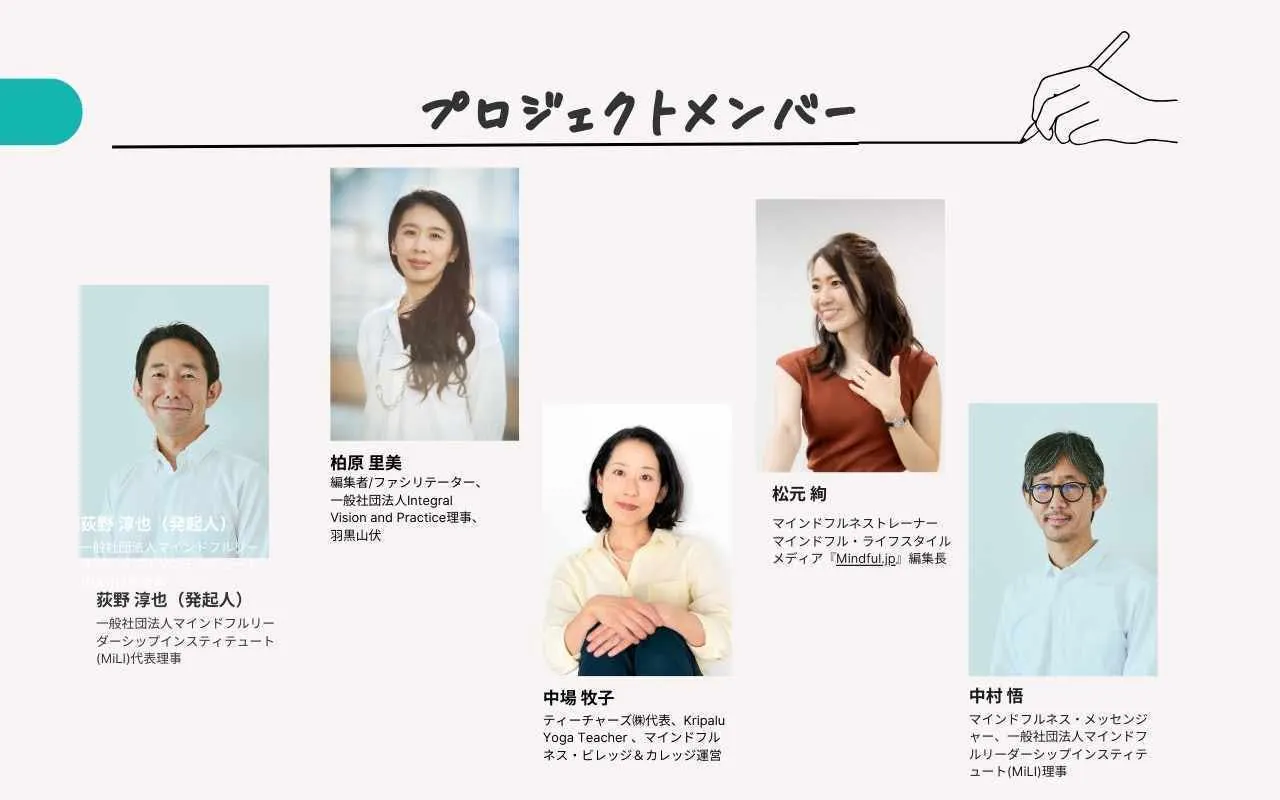 私たちは、SIY(Search Inside Youself)の認定講師であり、10年以上にわたり日本でのマインドフルネスの普及を推進している荻野淳也を発起人に、2024年に発足したプロジェクトです(メンバーのご紹介は後半にて)。