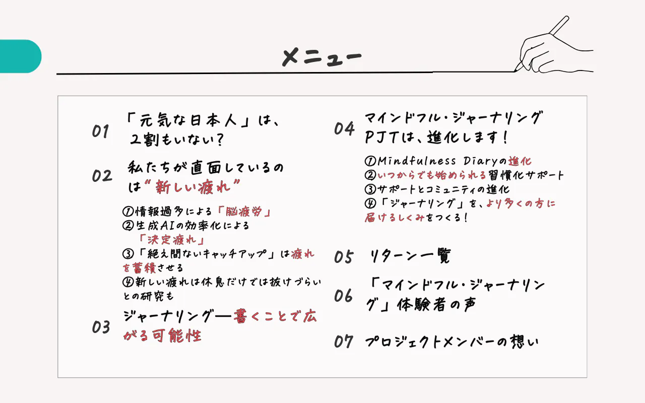 じつは先日、残暑の疲れから自律神経が乱れて、寝込んでしまいました。 振り返ると、忙しくてジャーナリングができなかった時期があり、 ここでいう「新しいタイプの疲れ」がたまっていたのかもしれません。 Mindfulness Diaryを開いて手書きしていくと、 不思議と脳がリセットされるような感覚を取り戻し、 あらためて、ジャーナリングの可能性を感じることができました。 今年はクラウドファンディング2年目のチャレンジ。 去年からご一緒くださっている方も、今年から参加される方も、 Mindfulness Diary 2026を通じて、つながれることをとても楽しみにしています。