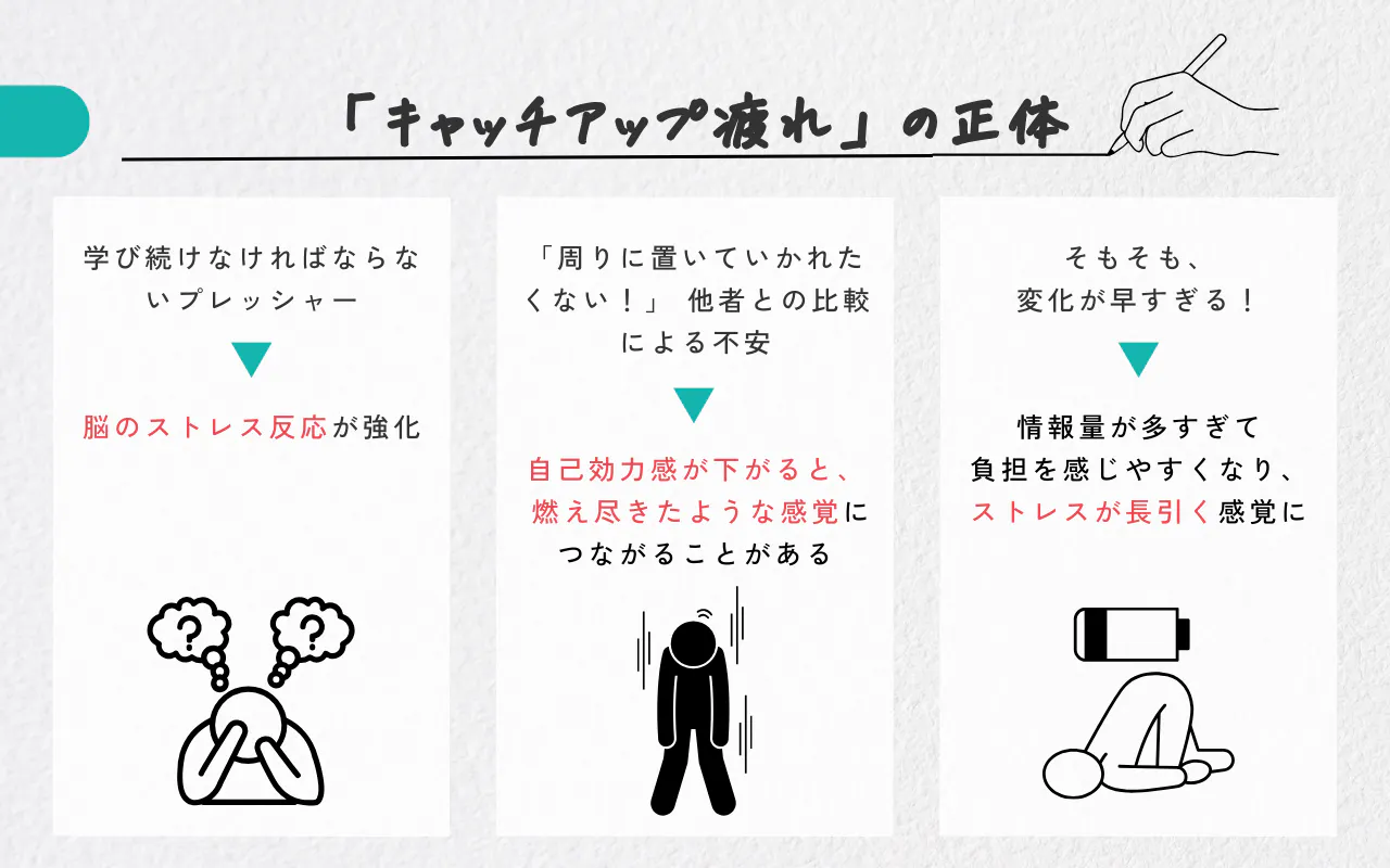 脳科学の研究でも、絶え間ない学び直しへの圧力はストレス反応を強め、疲労を蓄積させることが示されています。さらに心理学的にも「周囲との比較」が自己効力感を下げ、バーンアウトを招きやすいことがわかっています。