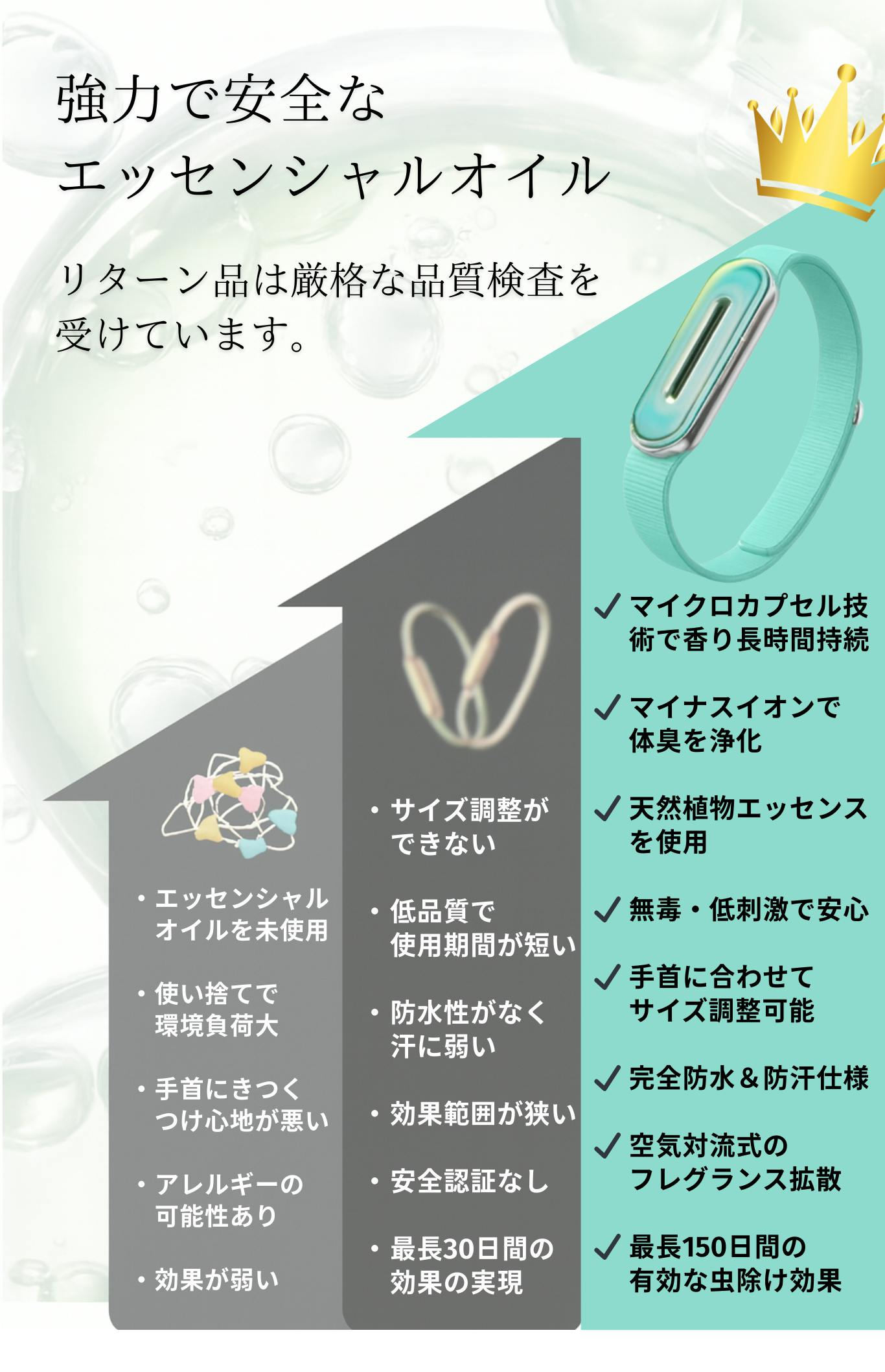150日間持続するエッセンスは、バンド本体だけでなく交換用として追加購入が可能です。