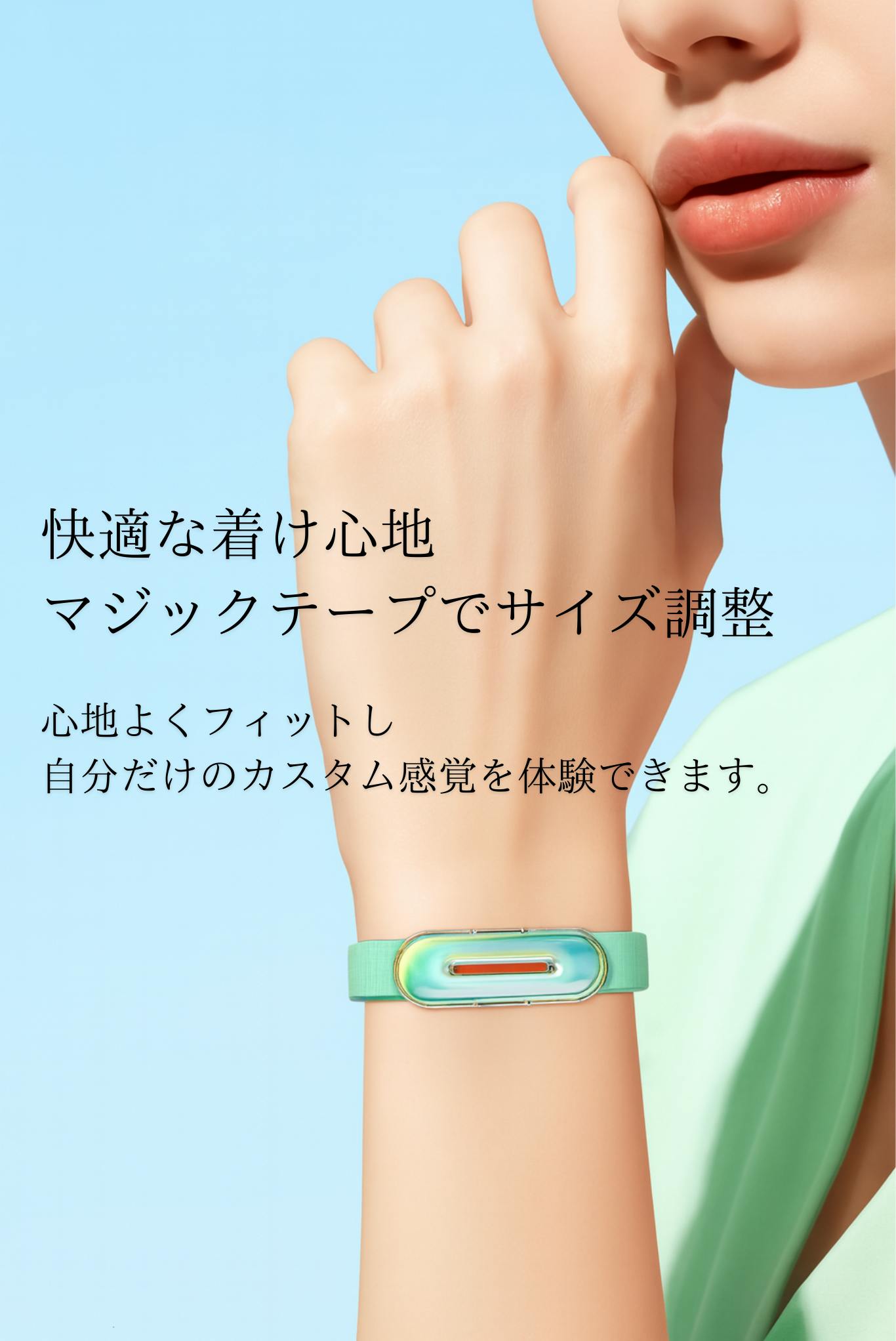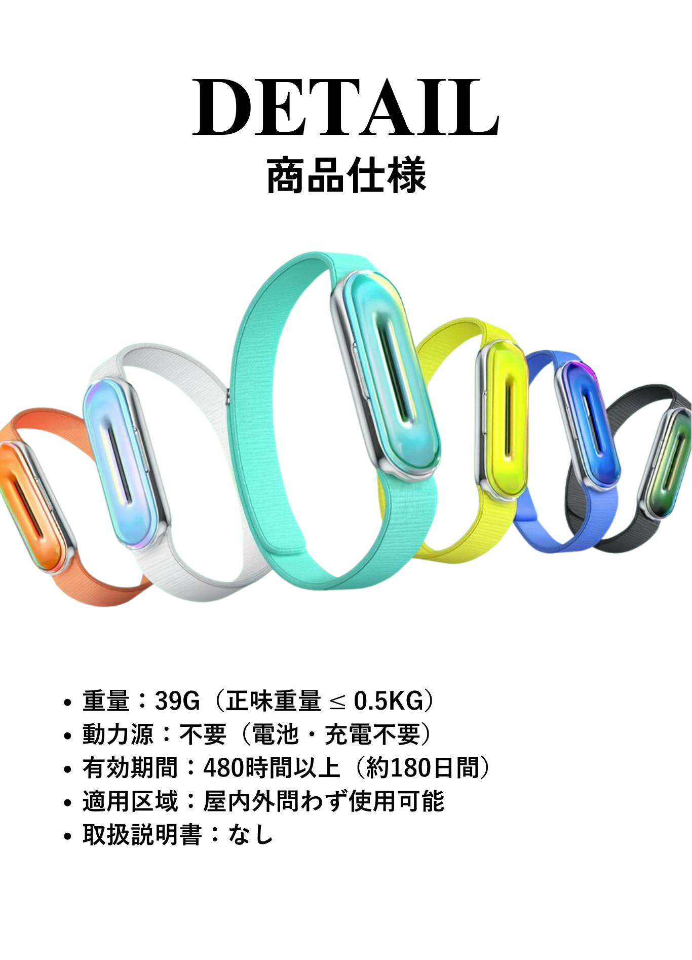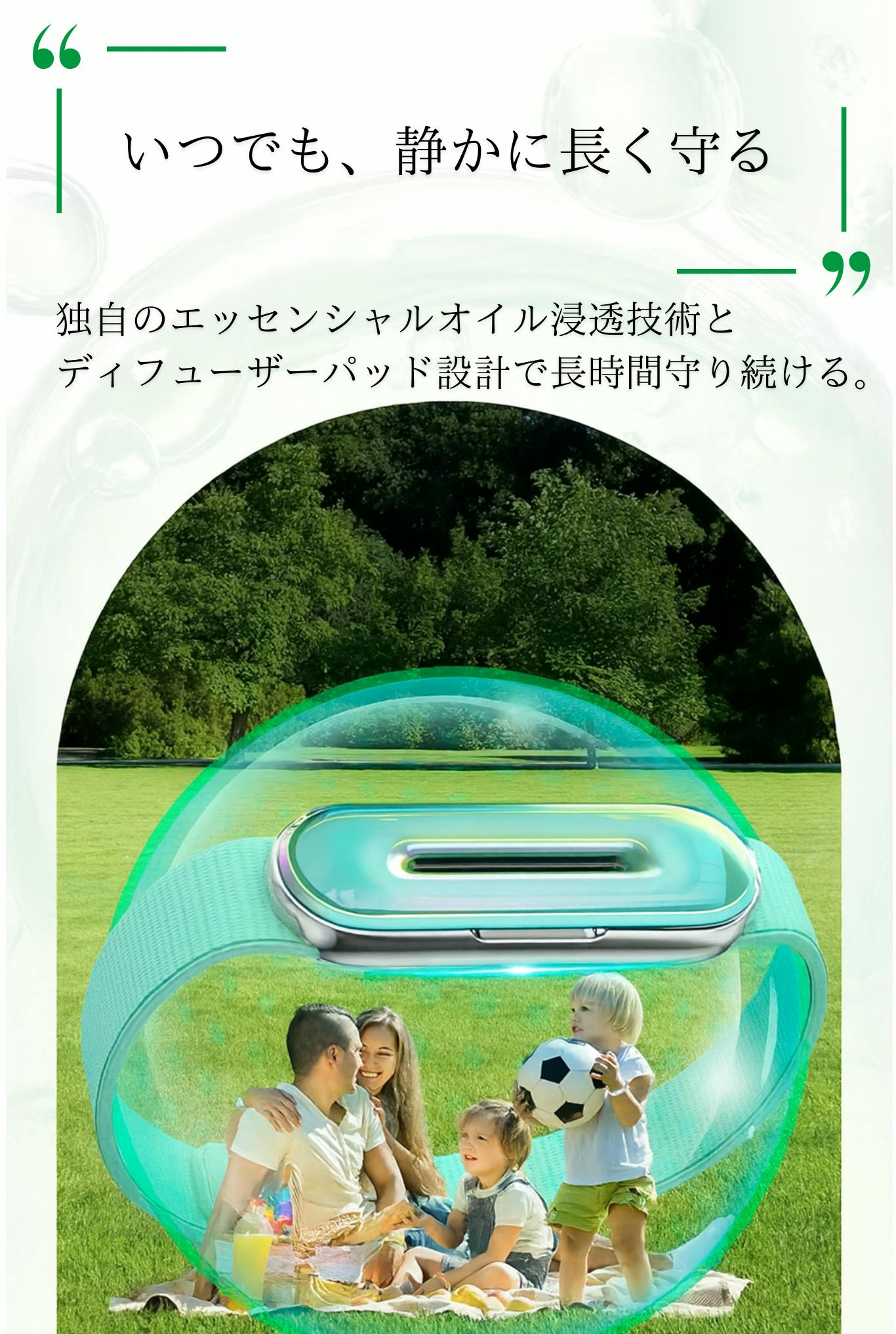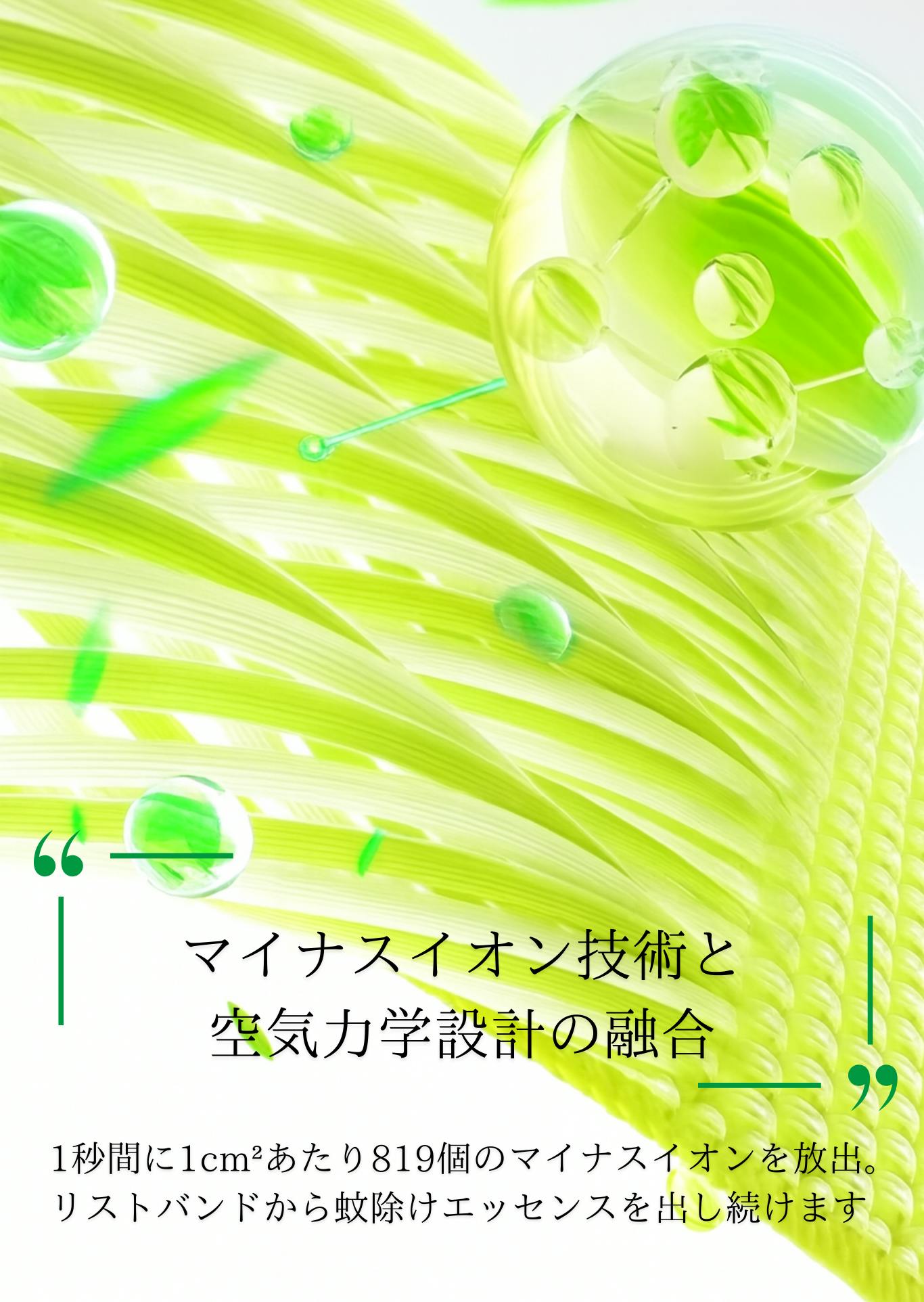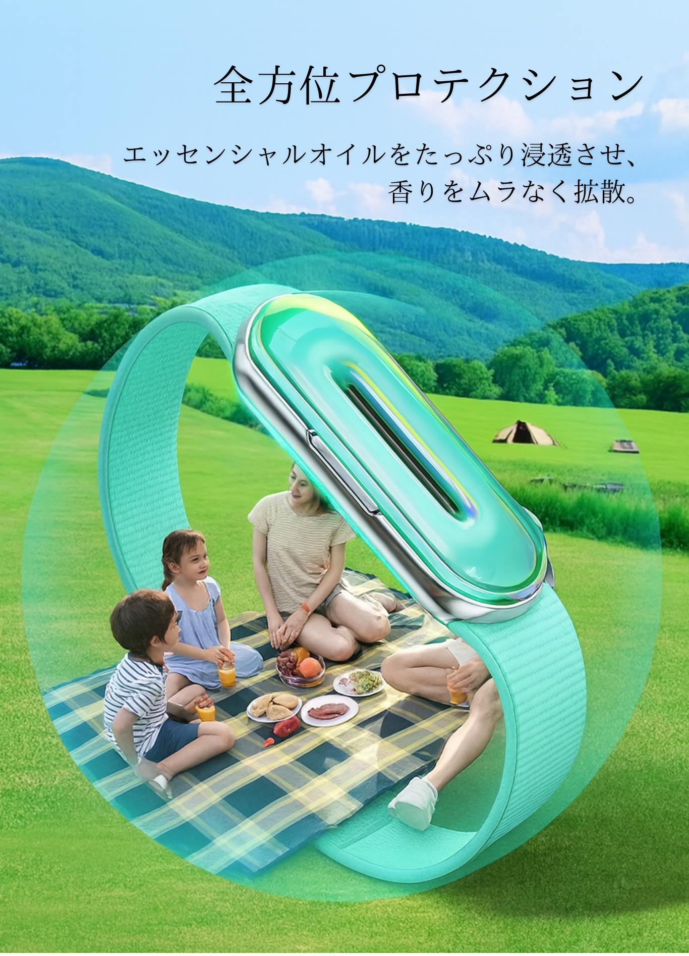 加えて、マイナスイオン技術と空気力学設計を組み合わせ、香り成分を効率よく拡散させることで、腕〜肩周囲に「香りのバリア」を形成。蚊が寄りつきにくい環境を自然に作り出します。化学的な殺虫剤を使わないため、子供や妊婦でも安心して使える、安全性と快適性を両立した新しいタイプの蚊除けアイテムです。
