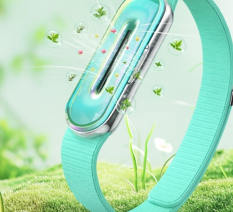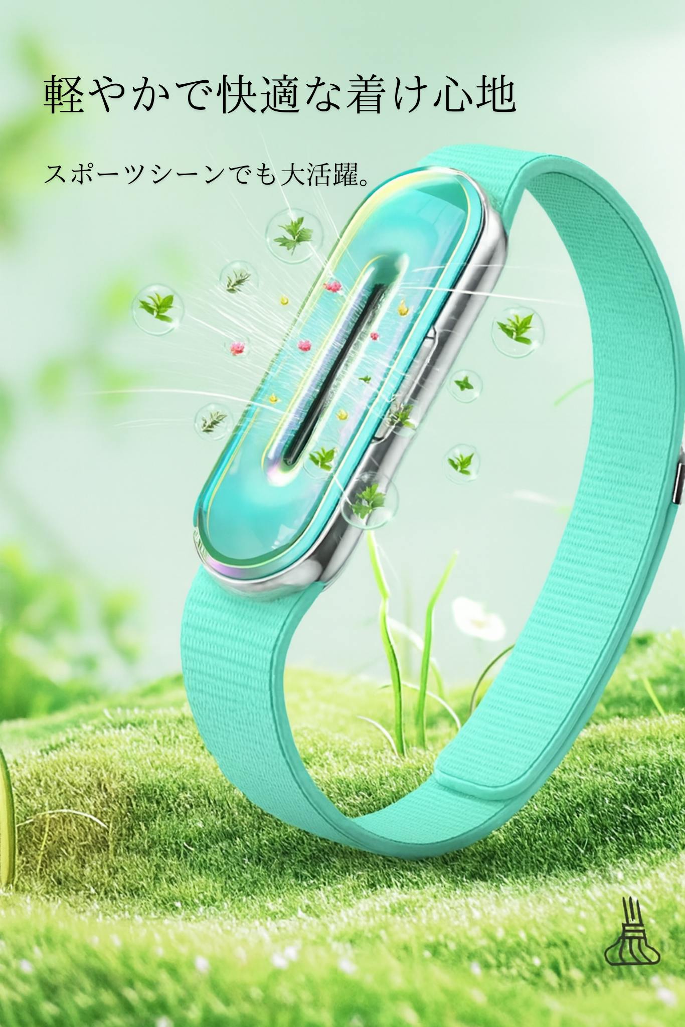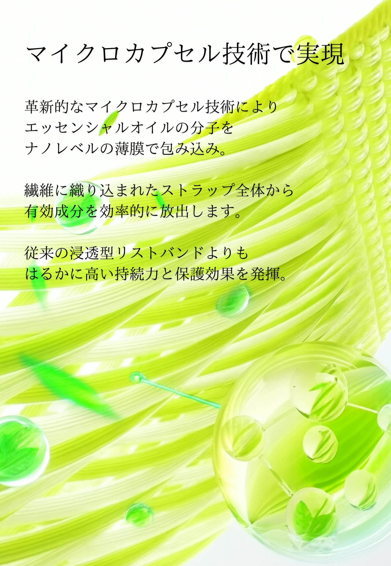 この蚊除けリストバンドは、天然植物由来のエッセンスをマイクロカプセル化して繊維に織り込み、時間をかけて少しずつ放出する仕組みを採用しています。