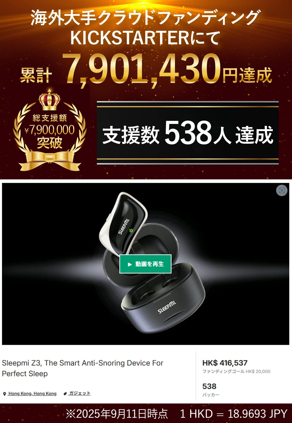 2025/12/01 00:01ご支援者様、AIでいびきを察知&対策。新時代のスマートいびきケア『Sleepmi Z3』にご興味をお持ちいただきありがとうございます。プロジェクト開始から37日目で66人ものご支援者の方々より支援頂き、無事プロジェクト終了を迎えることが出来ました。早速皆様のリターンを2026年02月末にお届けできるよう準備を始めております!皆様にご満足いただけるリターンをお届けできるよう、全力で取り組んで参りますので引き続き、「AIでいびきを察知&対策。新時代のスマートいびきケア『Sleepmi Z3』」をよろしくお願い致します。BRIGHTチーム もっと見るGizmodoでの掲載ページ紹介!