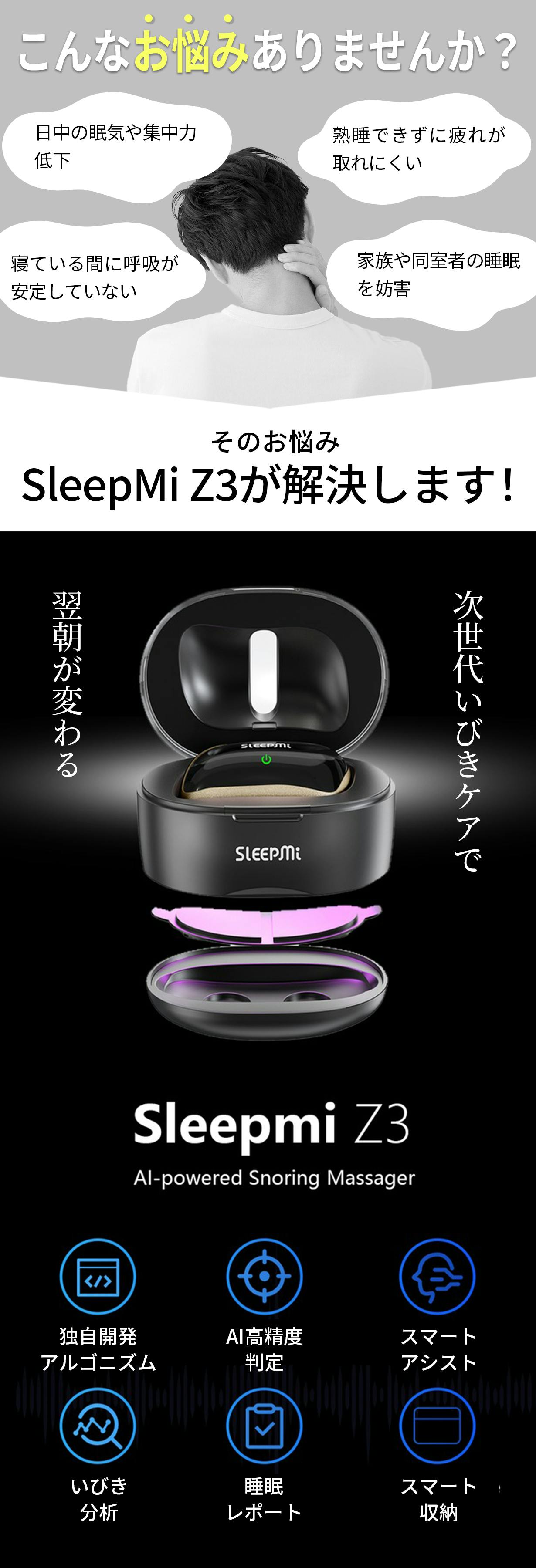 「Sleepmi Z3」はAIアルゴリズムとやさしいパルス刺激で喉の筋肉をサポートし、自然な呼吸と快適な睡眠を実現できるスマートデバイスです。