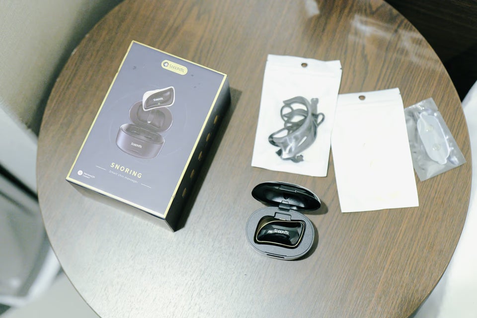 こちらいびき対策ガジェットの「Sleepmi Z3」。ケースに入った本体と付属品をパッと見た印象はワイヤレスイヤホンみたいですね。