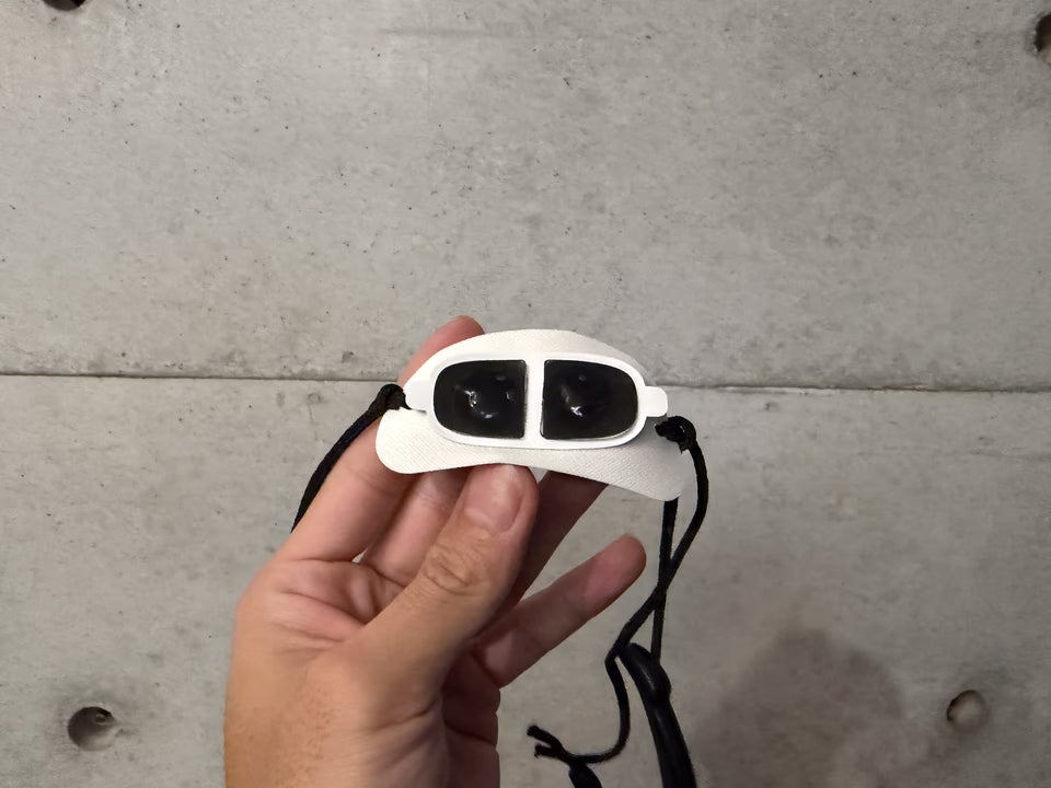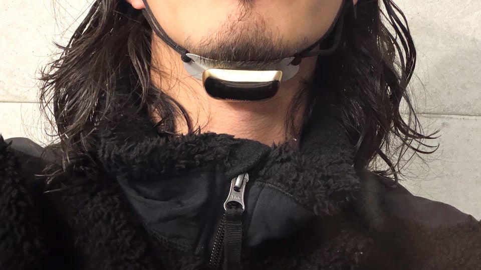 装着は写真のようにアゴの下。ジェルパッドは粘着性もあるのである程度くっついてくれますが、落下が気になる場合は耳ストラップ併用がオススメです。〉