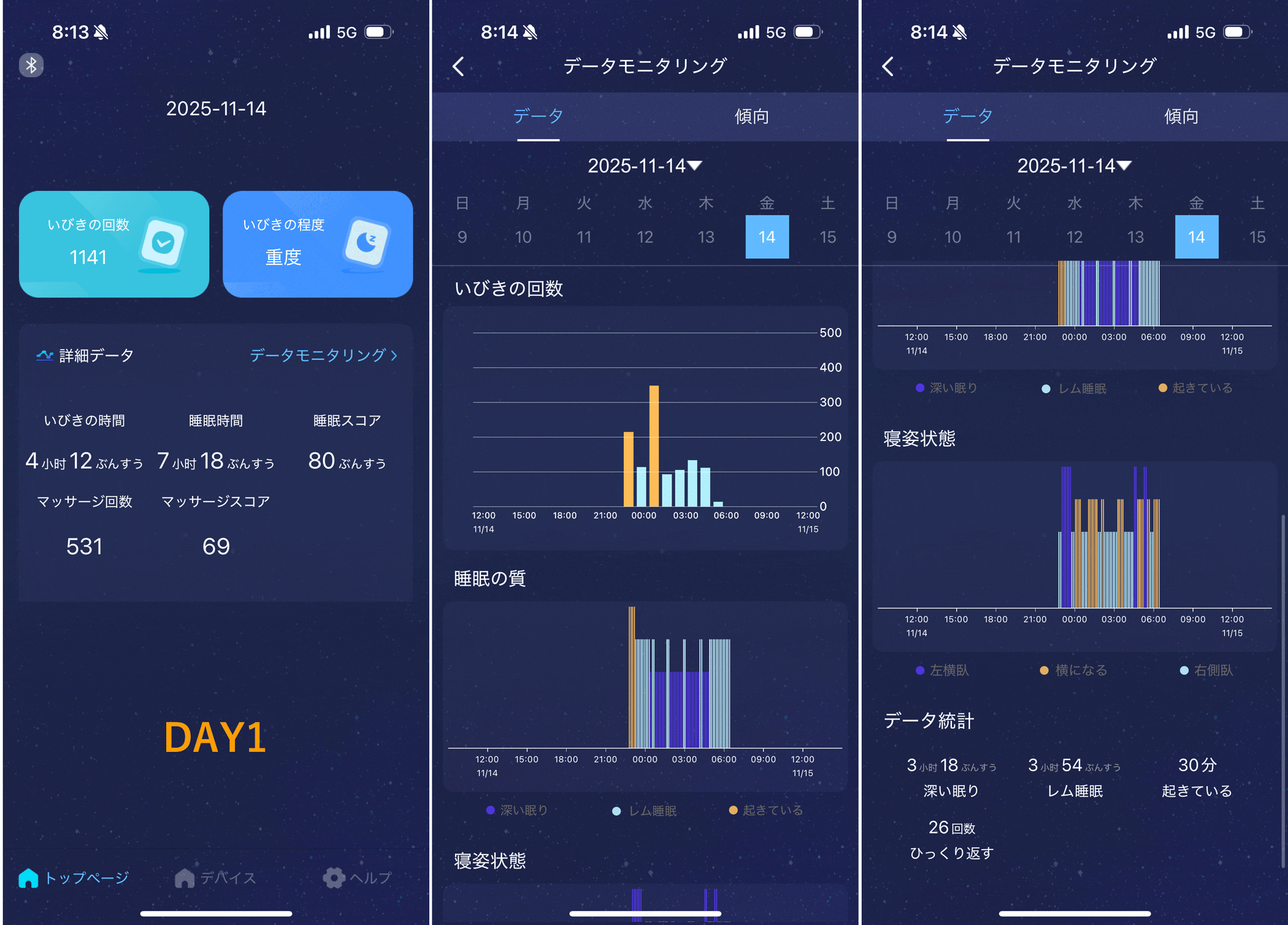 3日ほど使ってみましたが、記録精度は良さそうですね。寝姿勢(左右や仰向け)もトラッキングされていたのが面白いなと思いました。