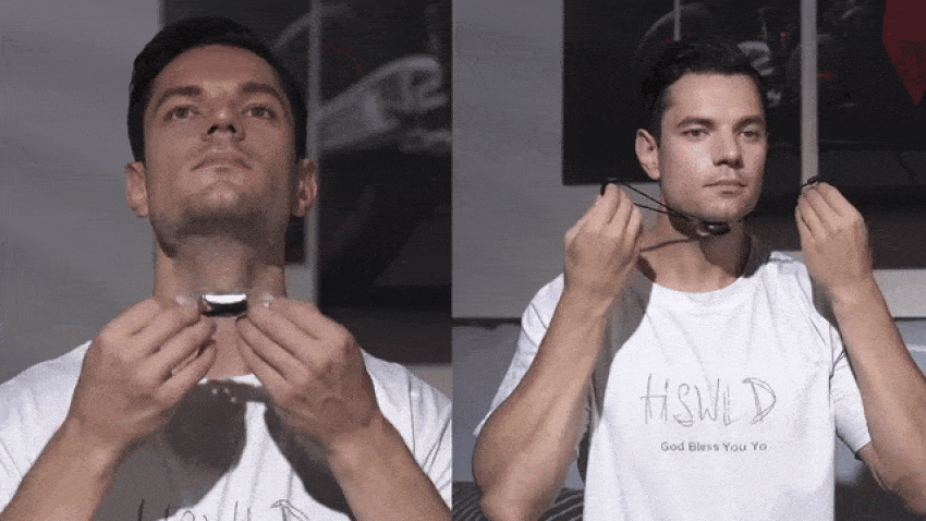 2. 顎にパッチを貼りつける、または耳かけして装着完了です。
