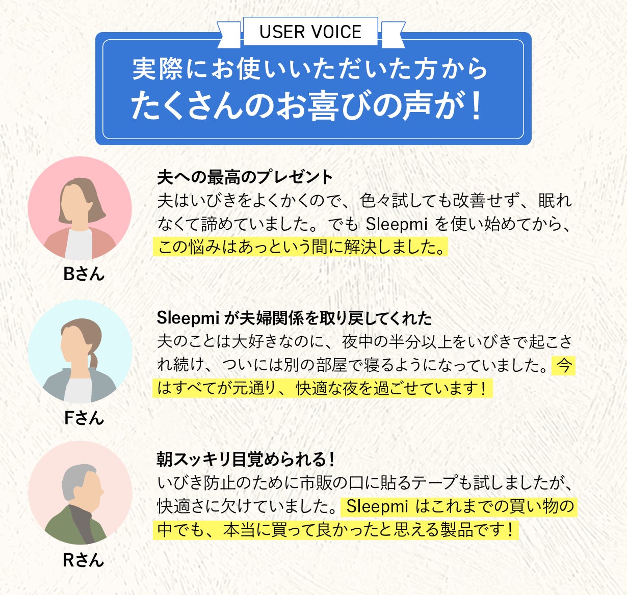Sleepmiは、快適な睡眠を実現するための高品質ないびき対策デバイスを開発しています。自社特許を活かし、これまでに世界中で10万人以上のユーザーのいびき改善をサポートしてきました。私たちは、同じ悩みを経験したからこそ、本当に役立つ製品をお届けしたいと考えています。