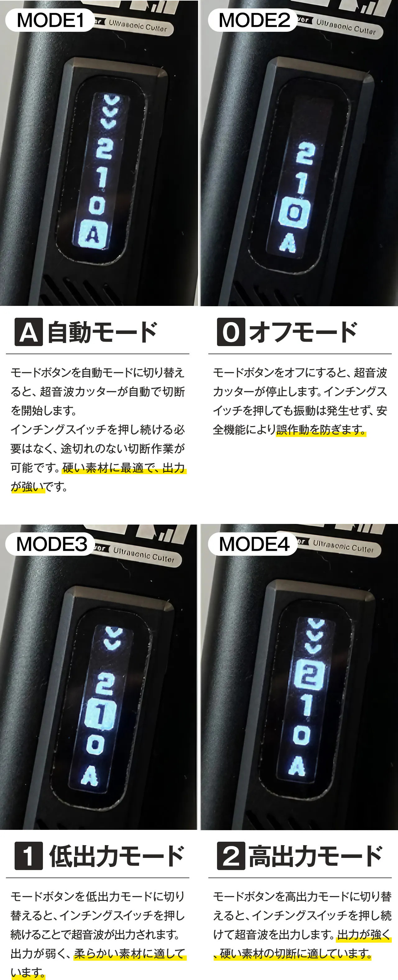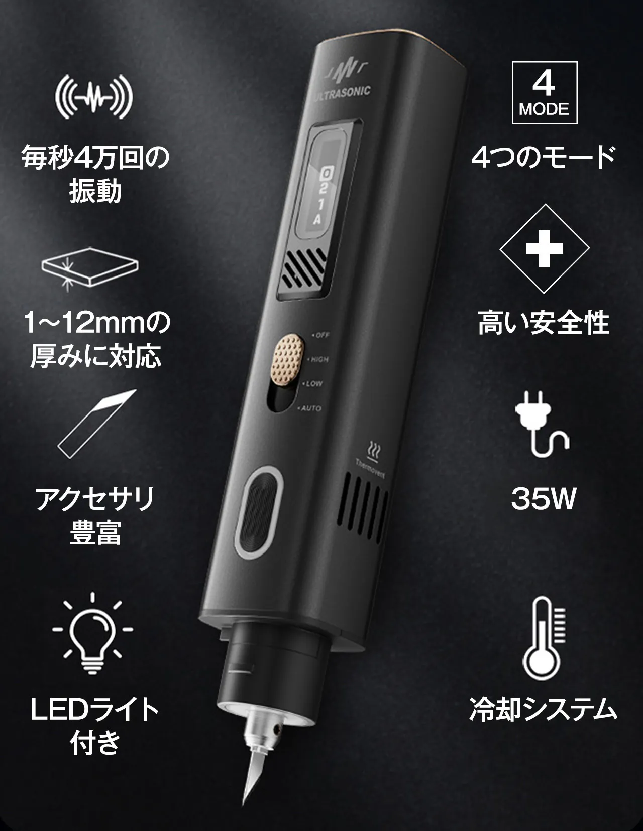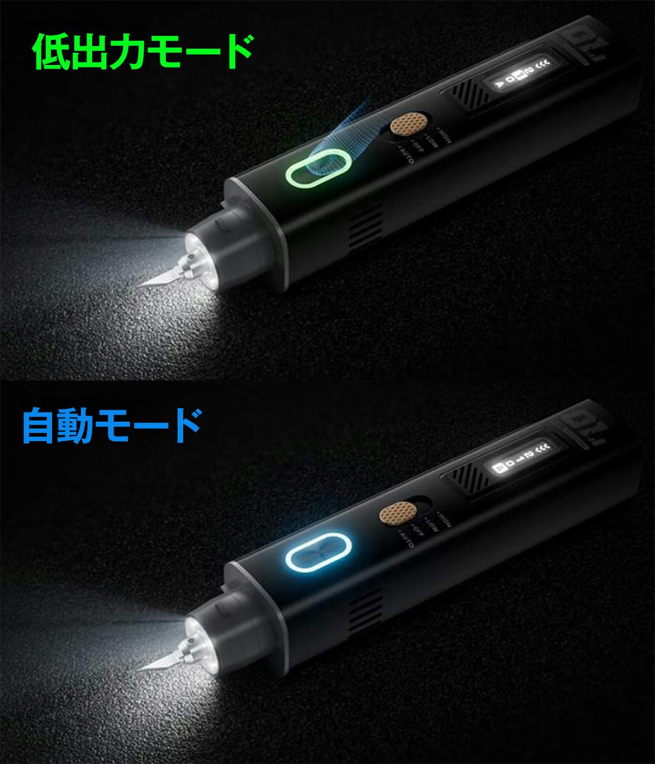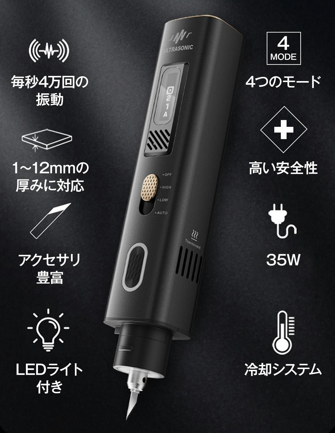 カッター内部には高感度温度センサーと電流安定化MOSが設置されており、カッター内部のセンサーおよびブースター回路から発生する熱を検出し、制御。内部温度が75°Cを超えると、カッターは保護のために自動的にシャットダウンし、再使用する前に約1〜3分間冷却されます。